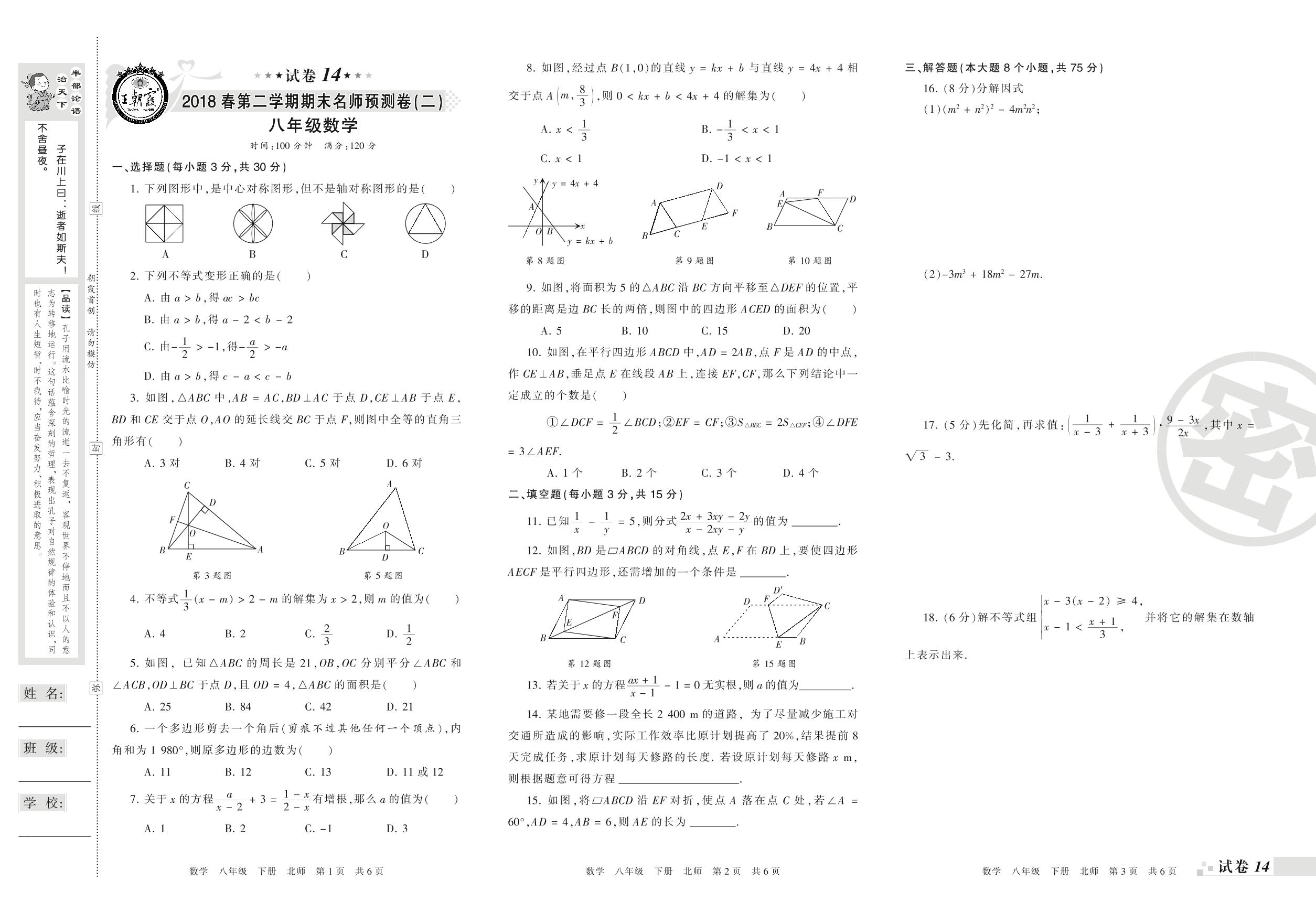 2017-2018学年第二学期期末预测卷(二)八年级数学(北师版)【14】