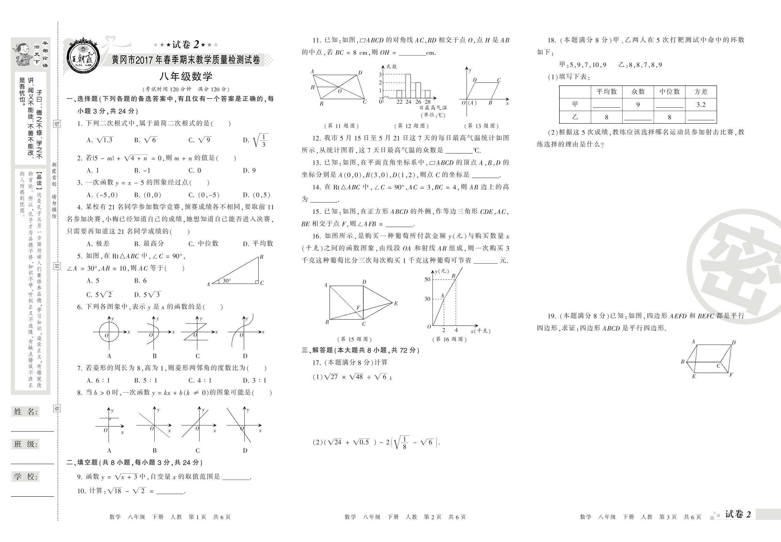 2016-2017学年第二学期黄冈市八年级数学试卷(人教版)【2】