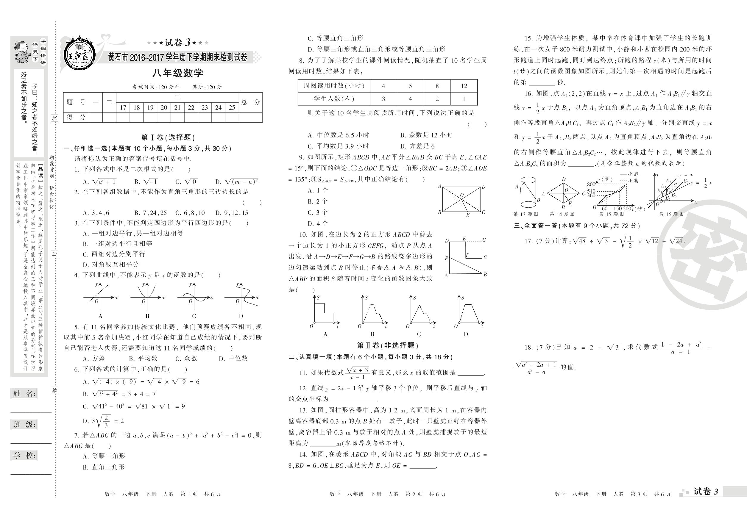 2016-2017学年第二学期黄石市八年级数学试卷(人教版)【3】