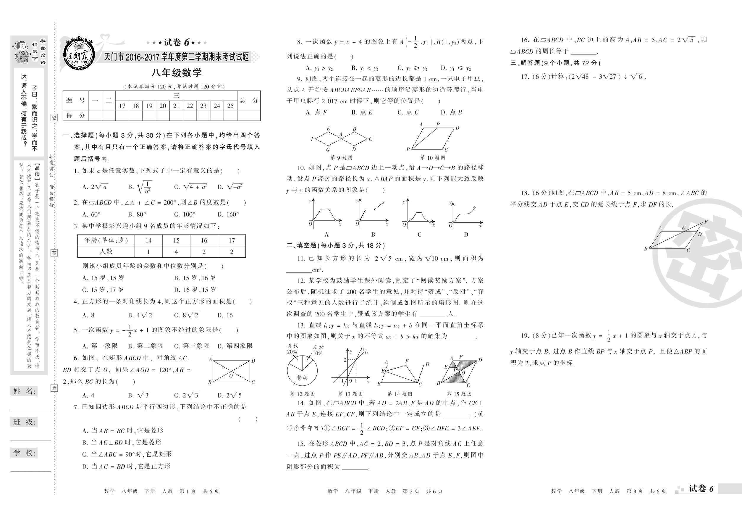 2016-2017学年第二学期天门市八年级数学试卷(人教版)【6】