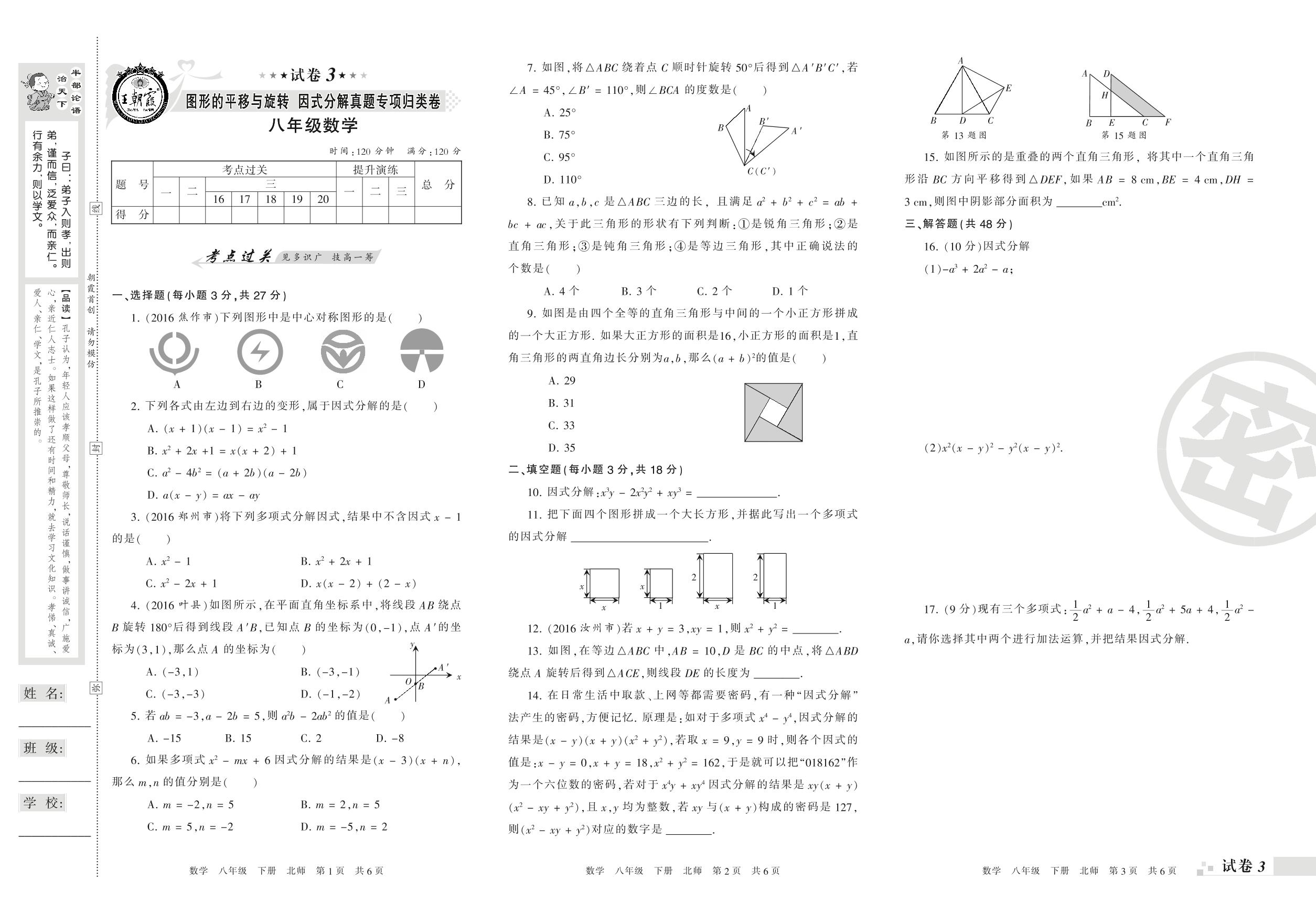王朝霞期末专项卷——图形的平移与旋转 因式分解真题专项归类卷八年级下册数学(北师版)【3】