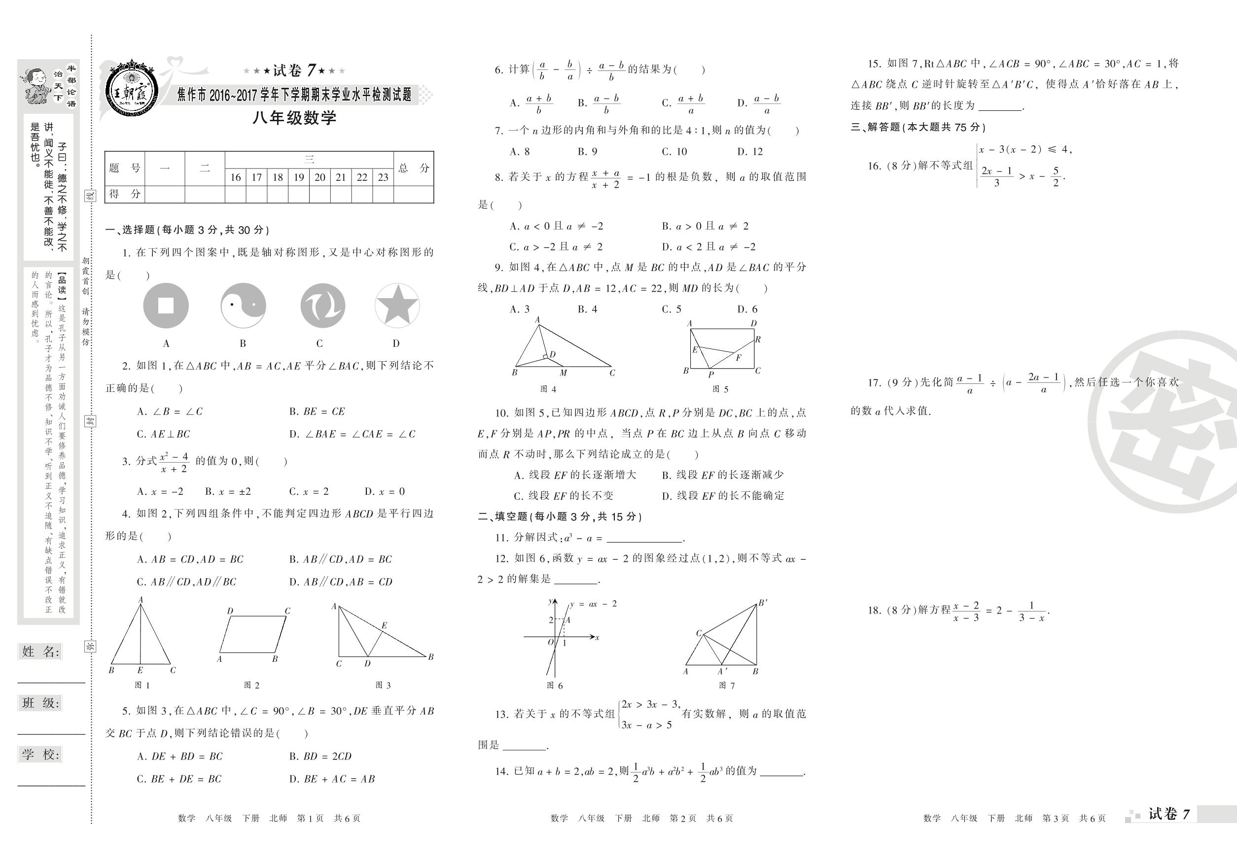 2016-2017学年第二学期焦作市八年级数学试卷(北师版)【7】