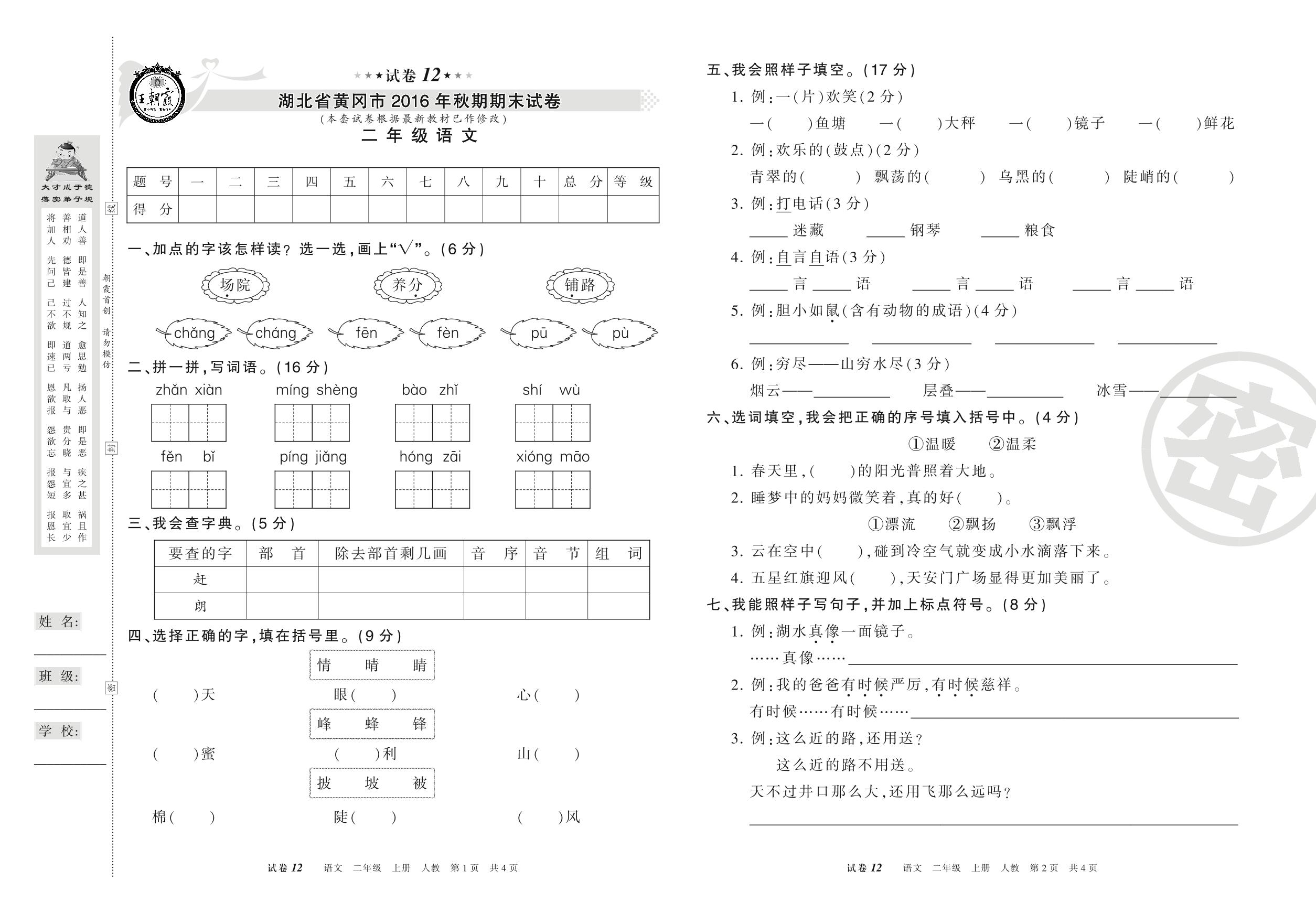 2016-2017学年第一学期湖北省黄冈市二年级语文试卷(人教版)【12】
