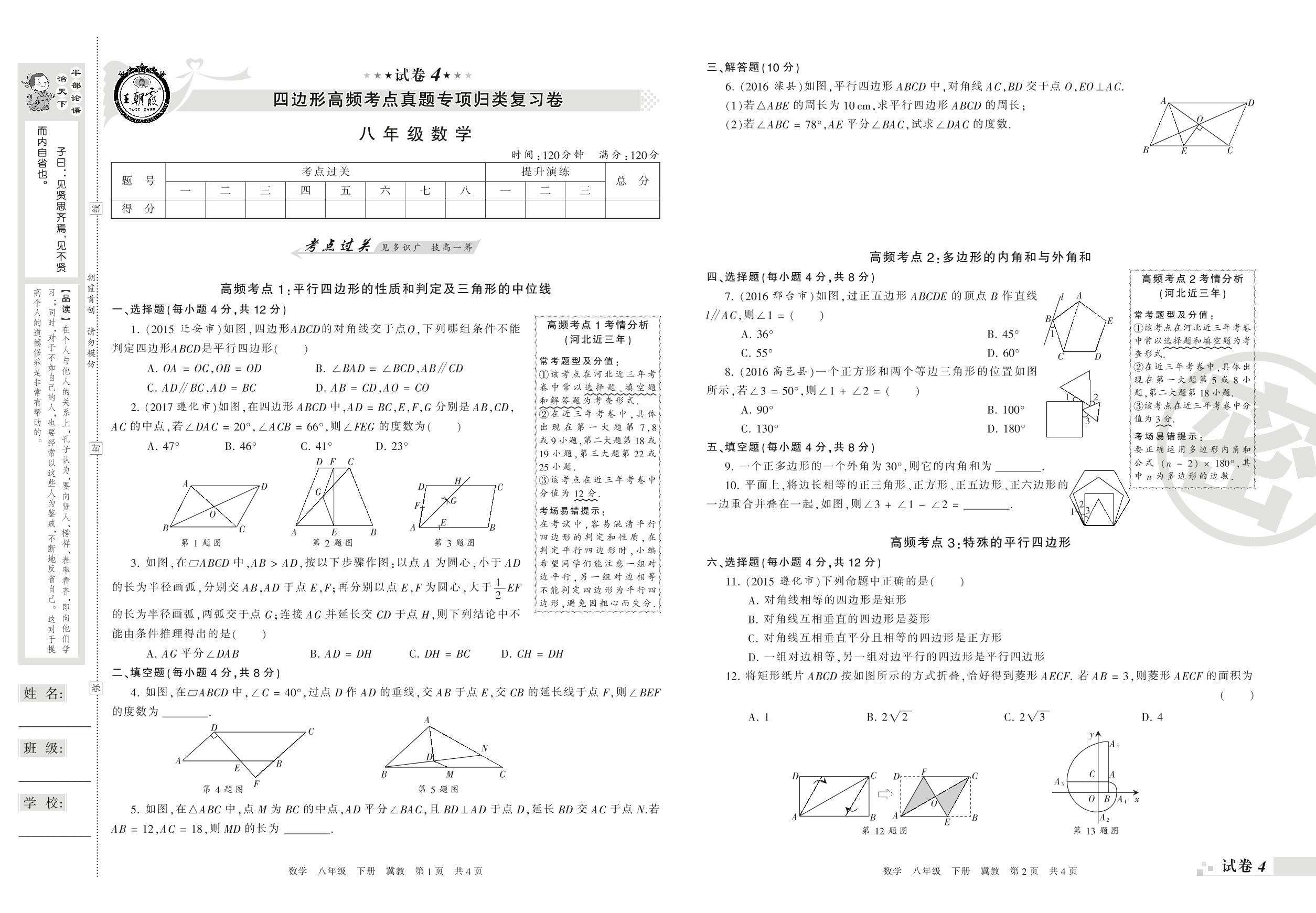 王朝霞期末专项卷——四边形高频考点真题专项归类复习卷八年级下册数学(冀教版)【4】