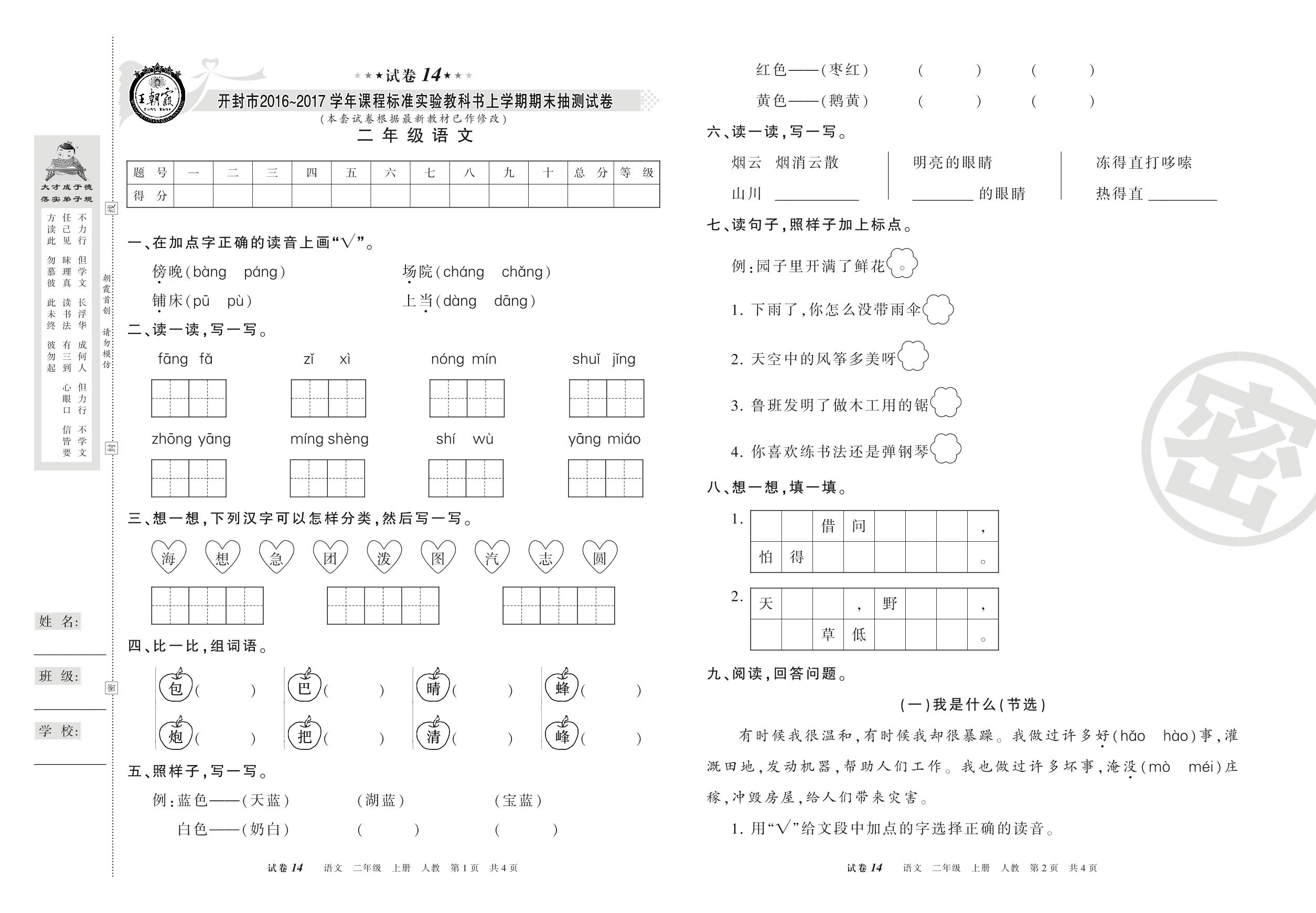 2016-2017学年第一学期开封市二年级语文试卷(人教版)_R21080175831【14】
