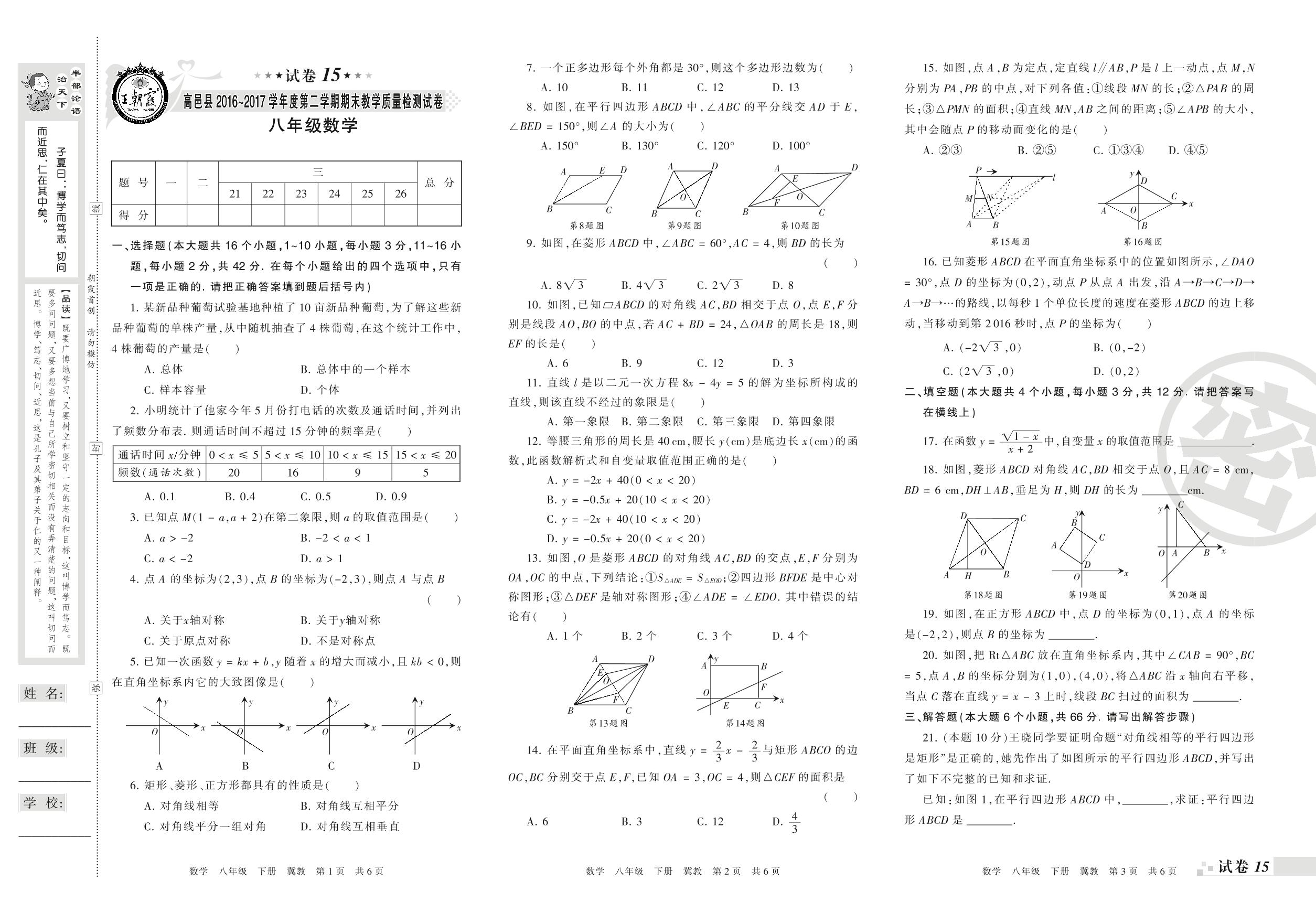 2016-2017学年第二学期石家庄市高邑县八年级数学试卷(冀教版)【15】