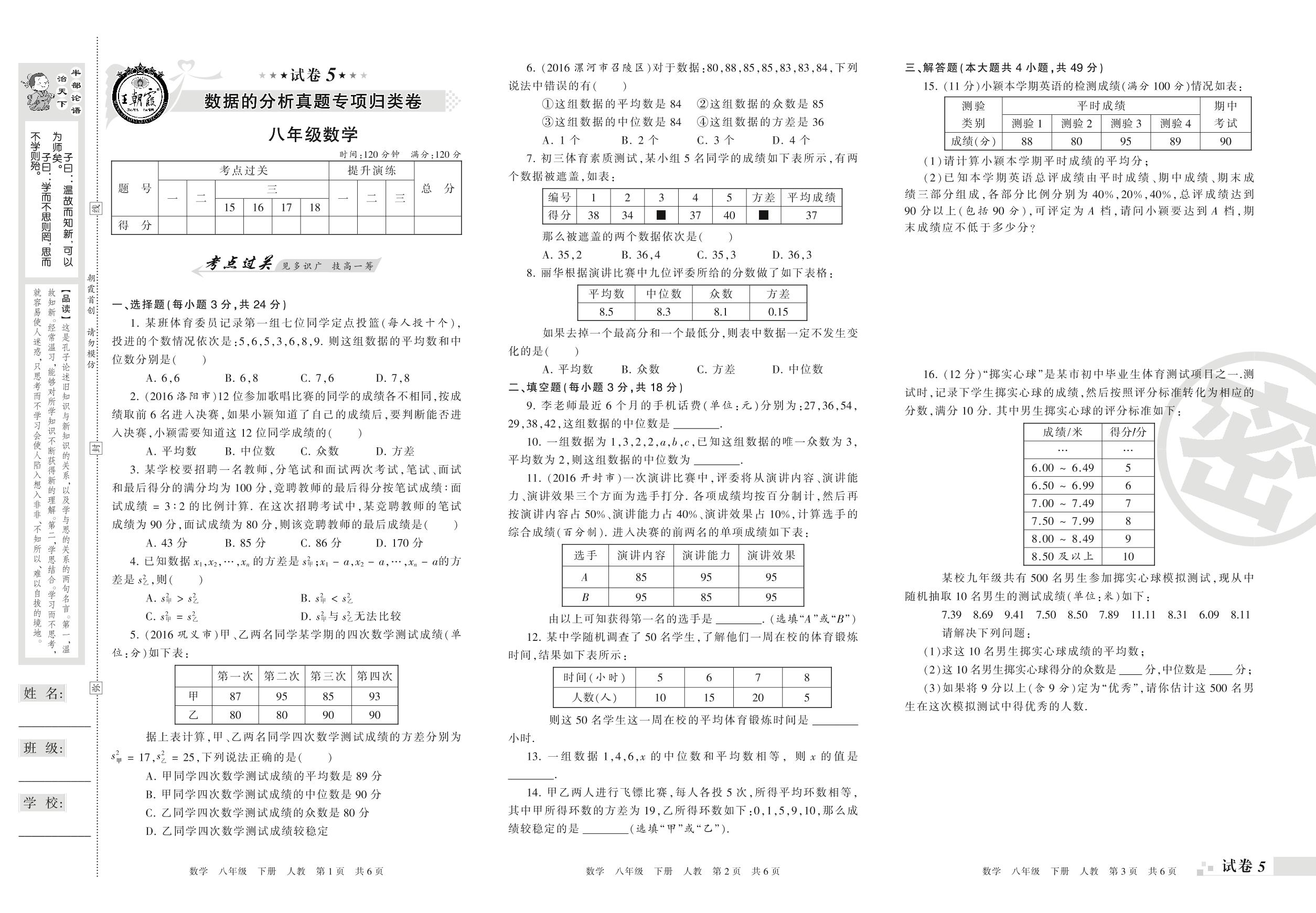 王朝霞期末专项卷——数据的分析真题专项归类卷八年级下册数学(人教版)_R220124104937550【5】