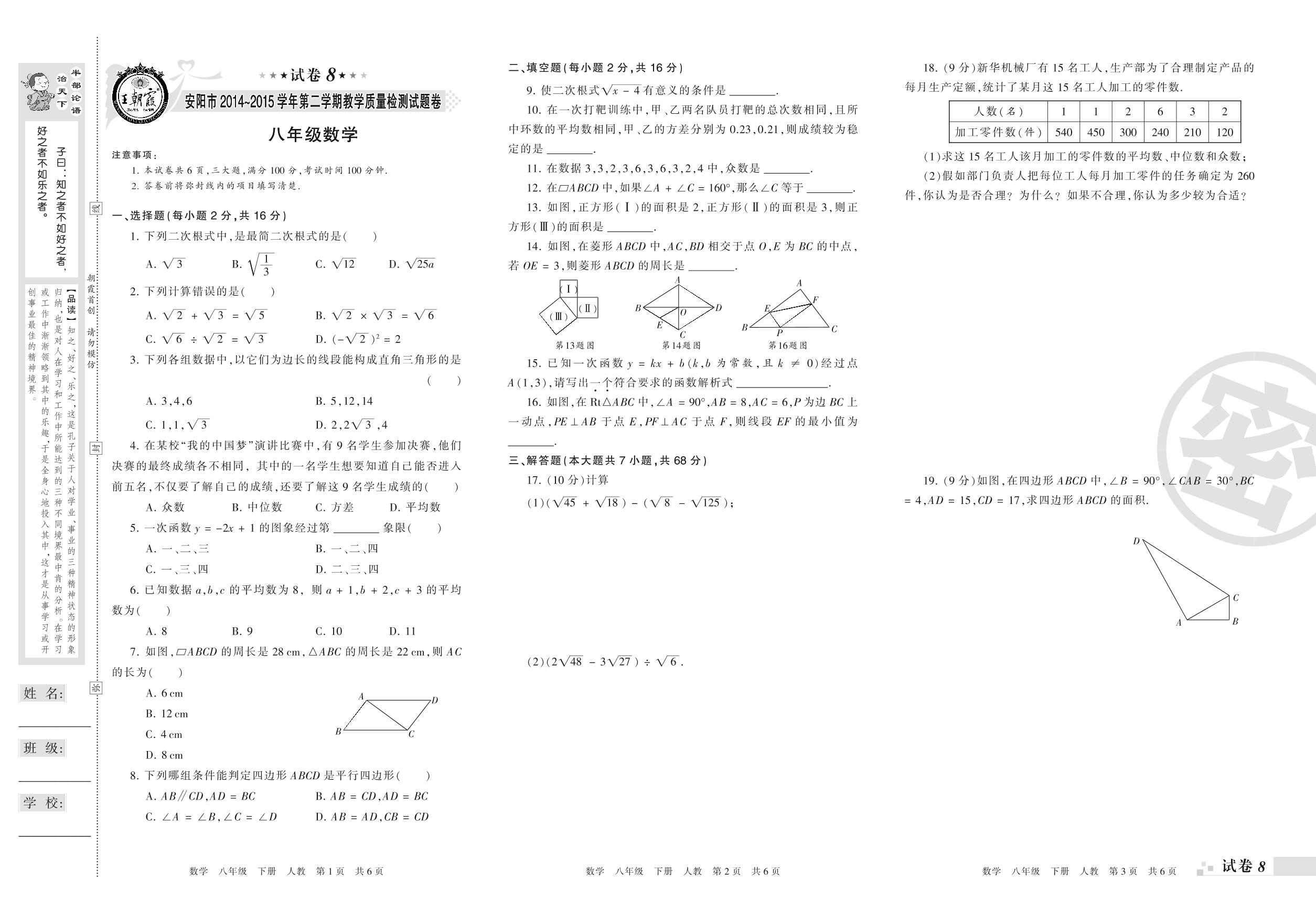 2014-2015学年第二学期安阳市八年级数学试卷(人教版)【8】