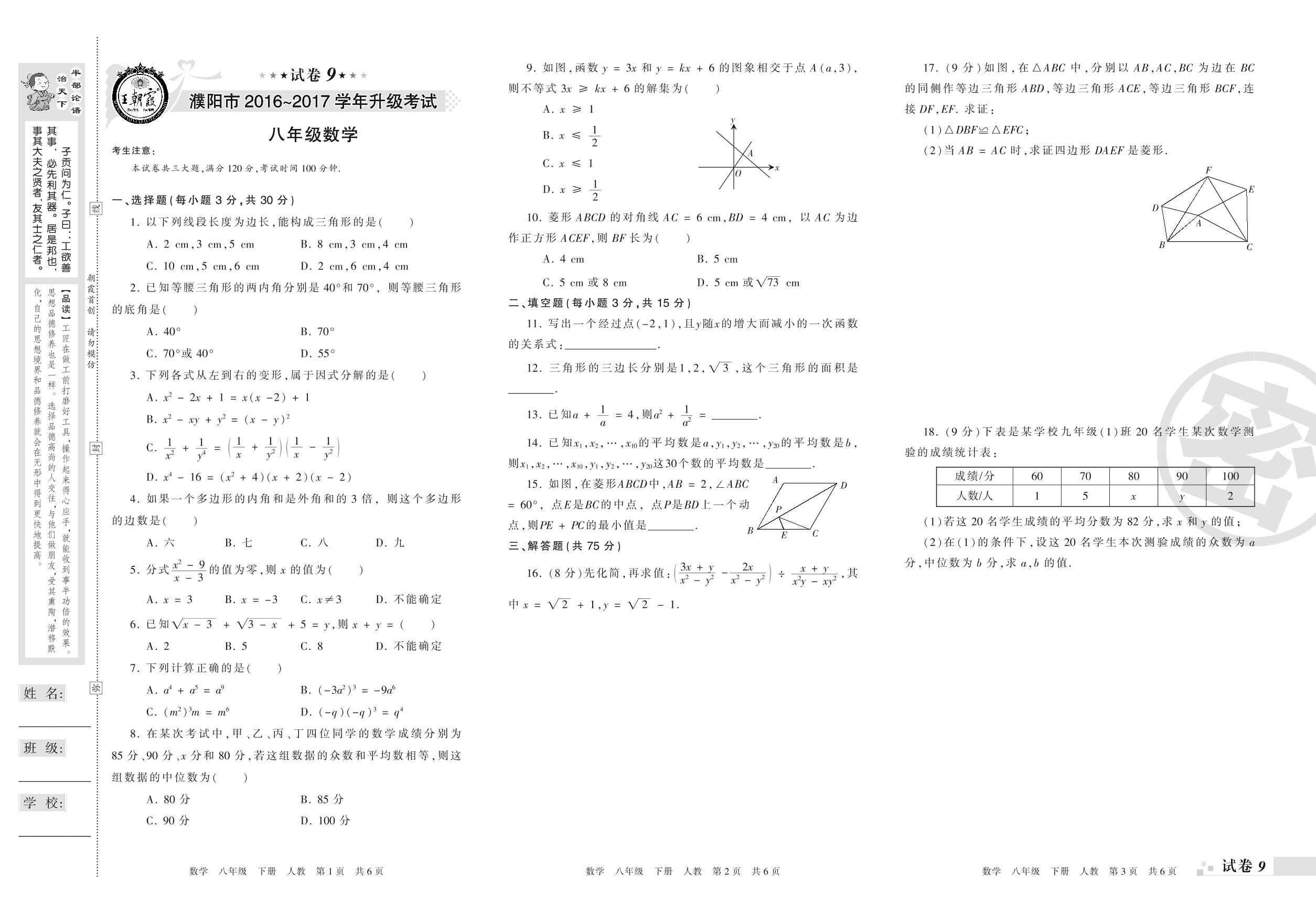 2016-2017学年第二学期濮阳市八年级数学试卷(人教版)【9】