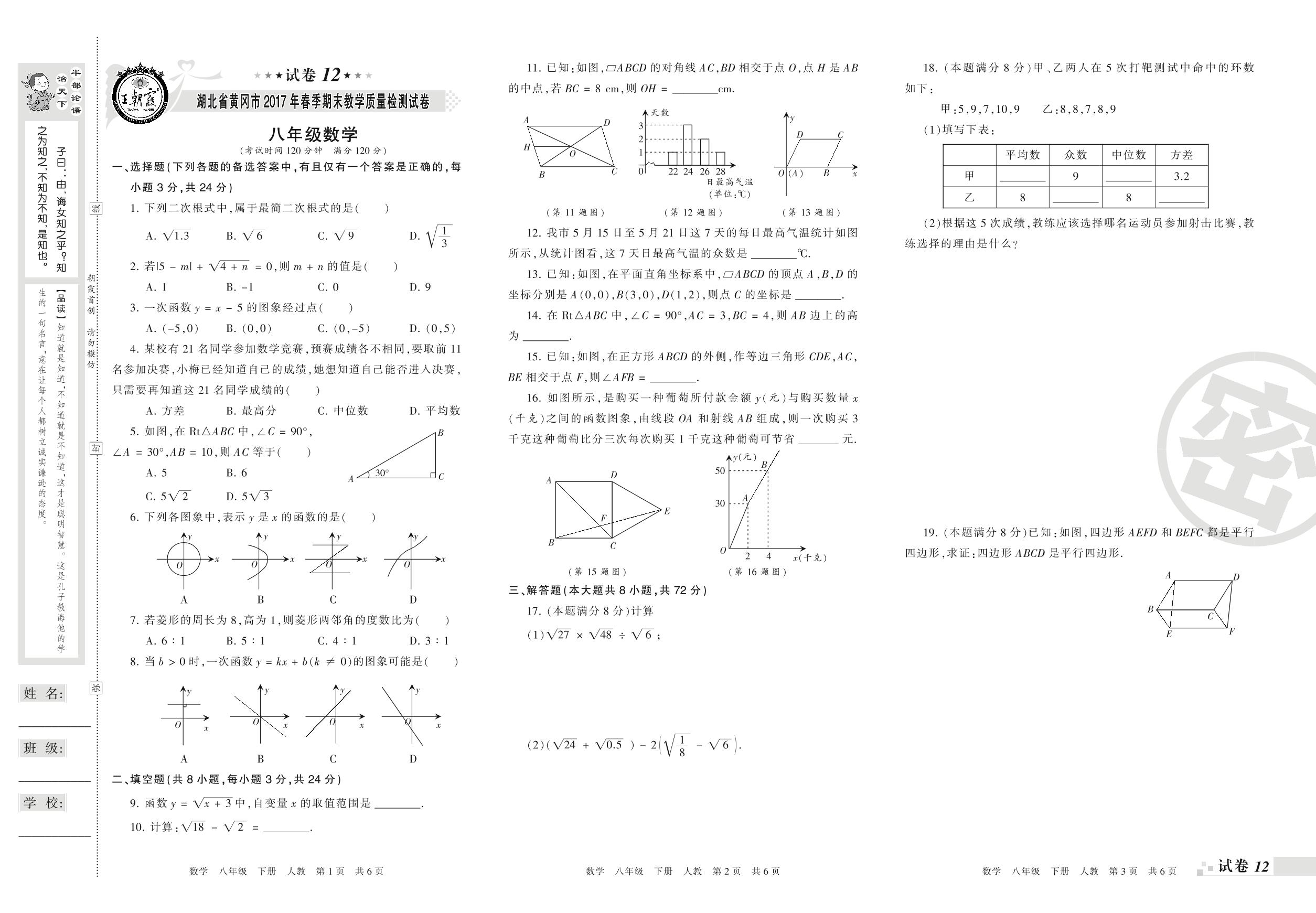 2016-2017学年第二学期湖北省黄冈市八年级数学试卷(人教版)【12】