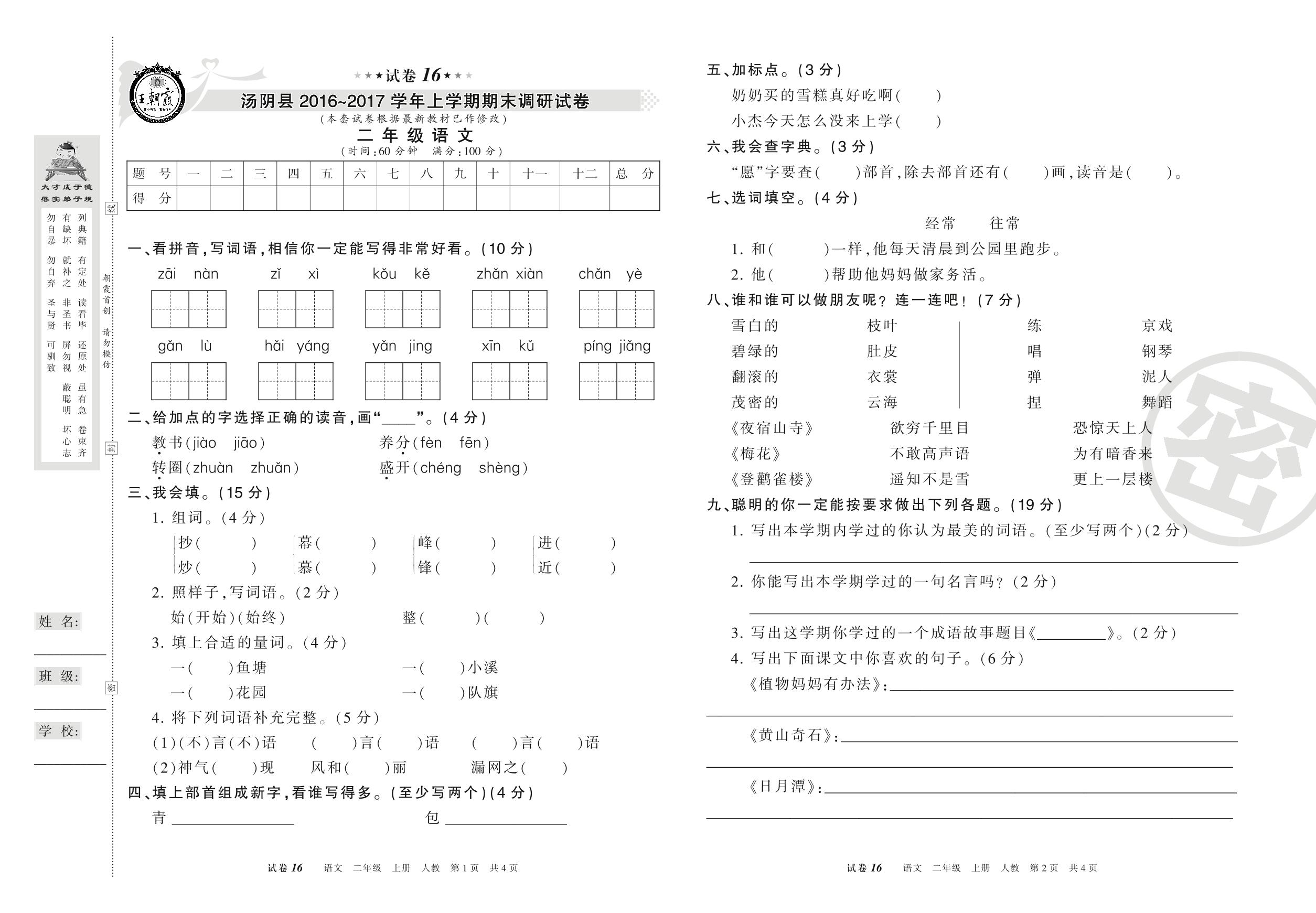 2016-2017学年第一学期安阳市汤阴县二年级语文试卷(人教版)【16】