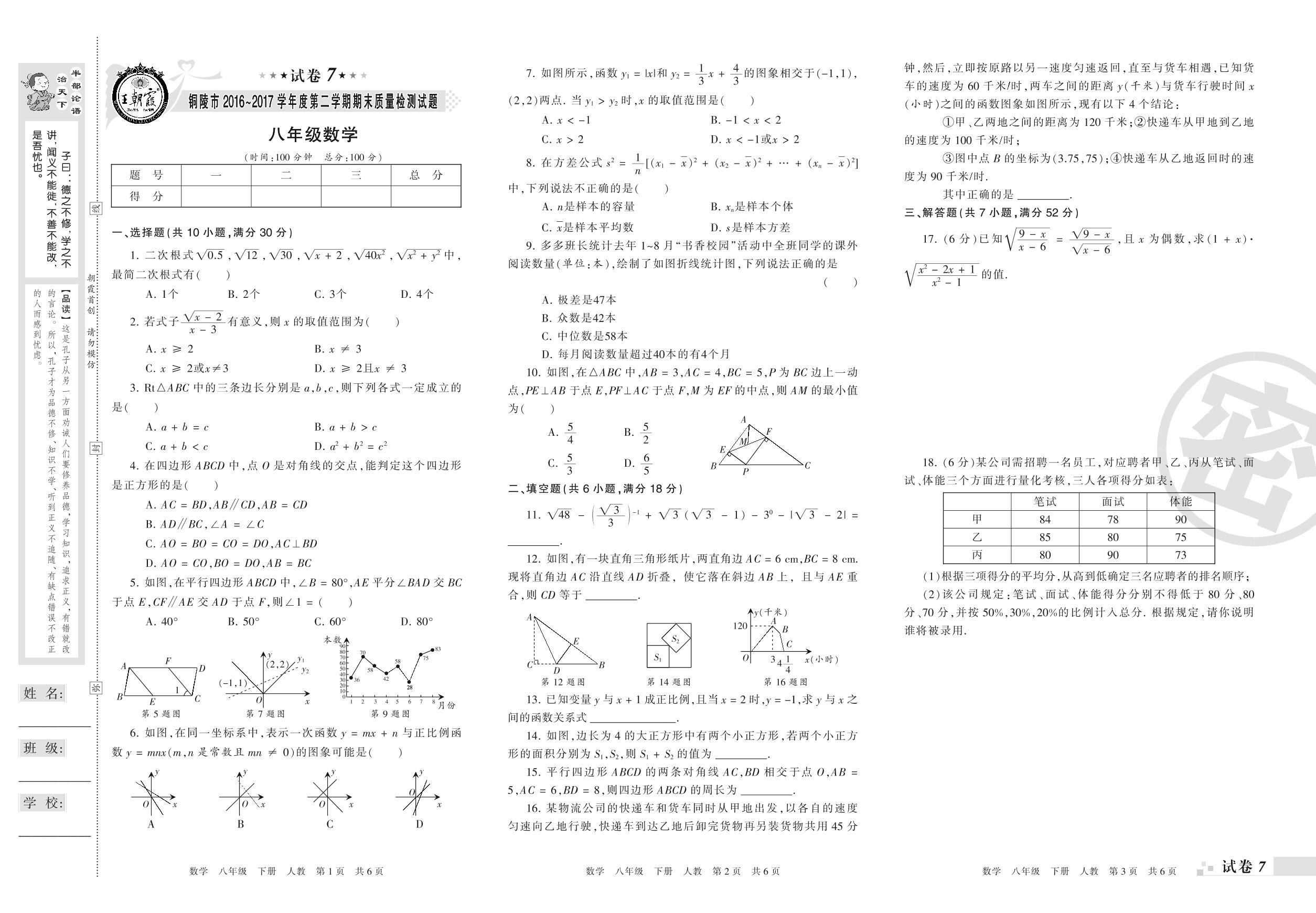 2016-2017学年第二学期铜陵市八年级数学试卷(人教版)【7】