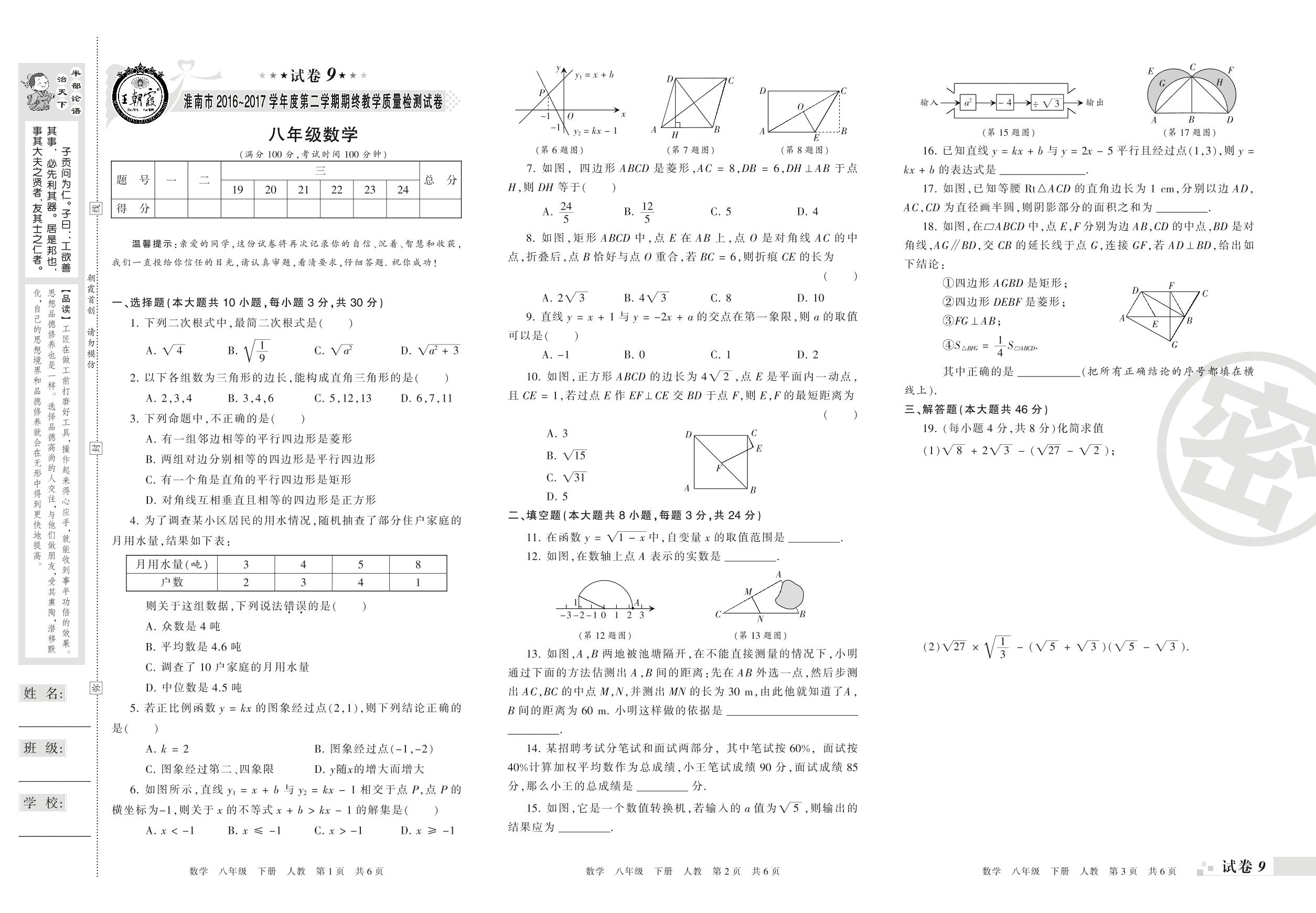 2016-2017学年第二学期淮南市八年级数学试卷(人教版)【9】
