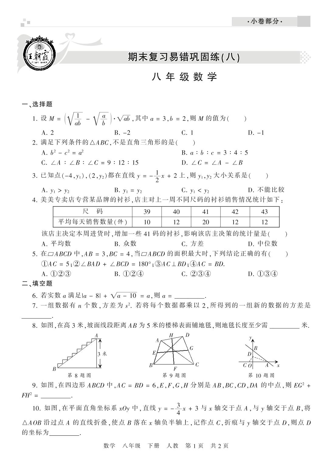 王朝霞期末小卷——期末复习易错巩固练(八)八年级下册数学(人教版)【0】