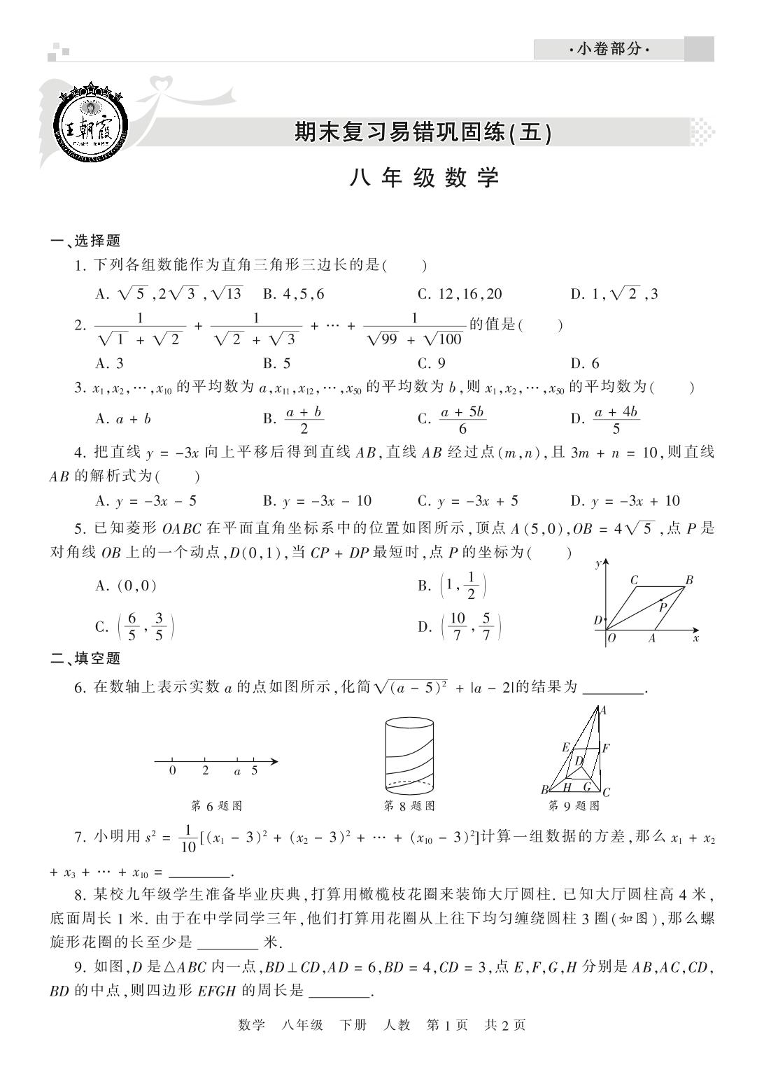 王朝霞期末小卷——期末复习易错巩固练(五)八年级下册数学(人教版)【0】