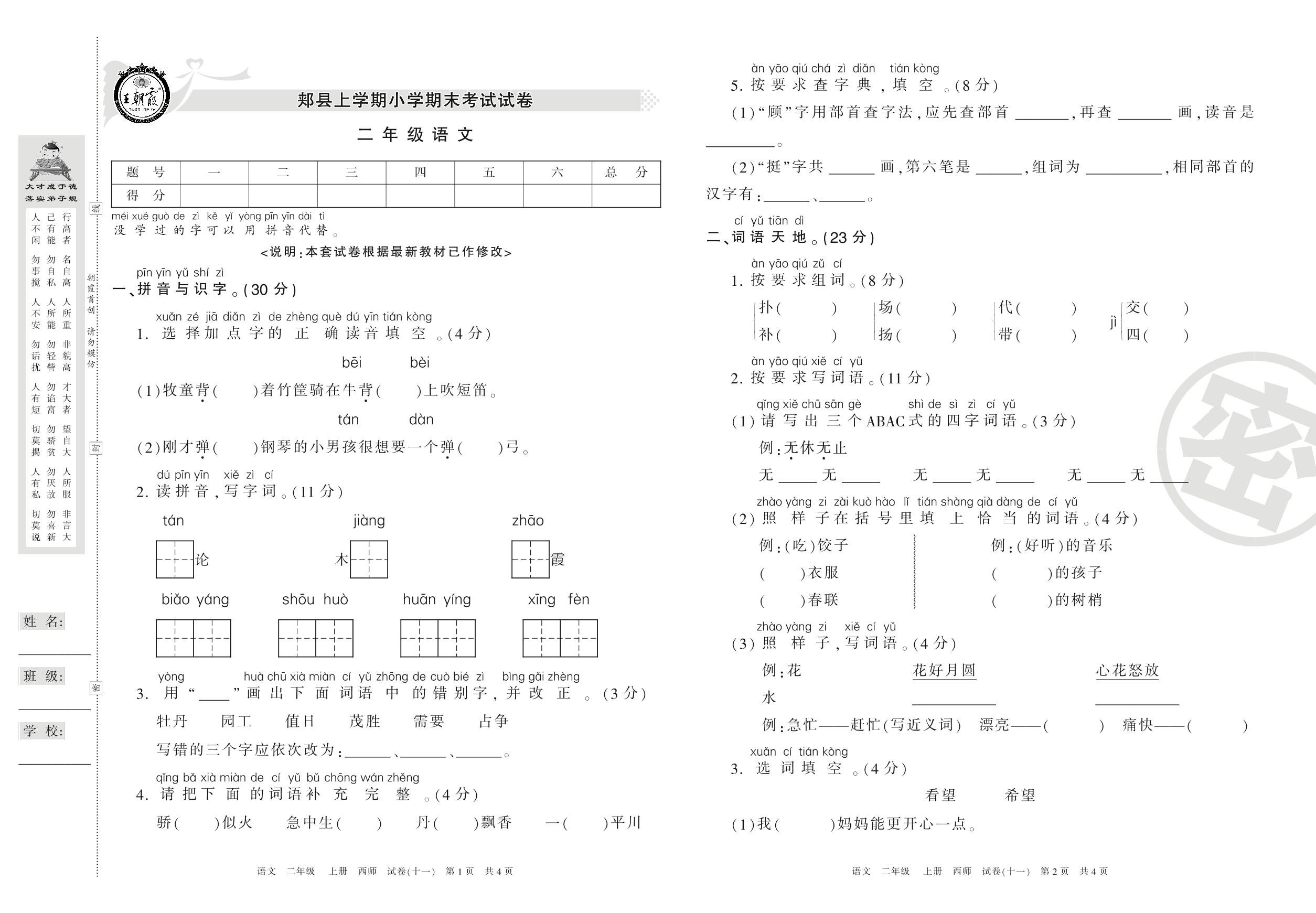 2016-2017学年第一学期平顶山市郏县二年级语文试卷(西师版)【11】