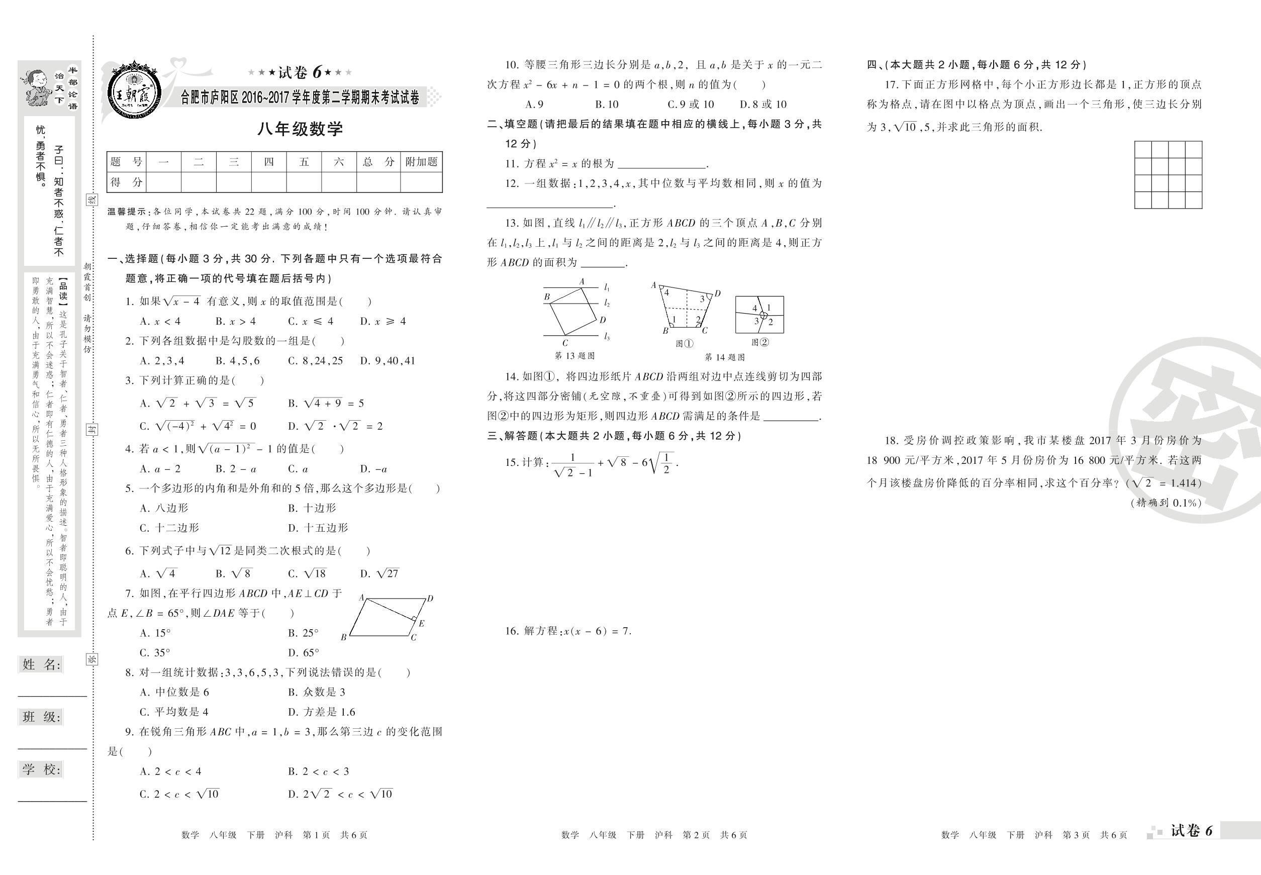 2016-2017学年第二学期合肥市庐阳区八年级数学试卷(沪科版)【6】