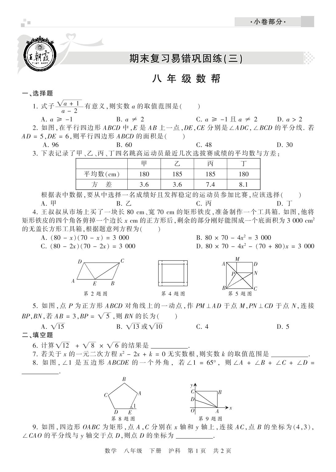 王朝霞期末小卷——期末复习易错巩固练(三)八年级下册数学(沪科版)【0】