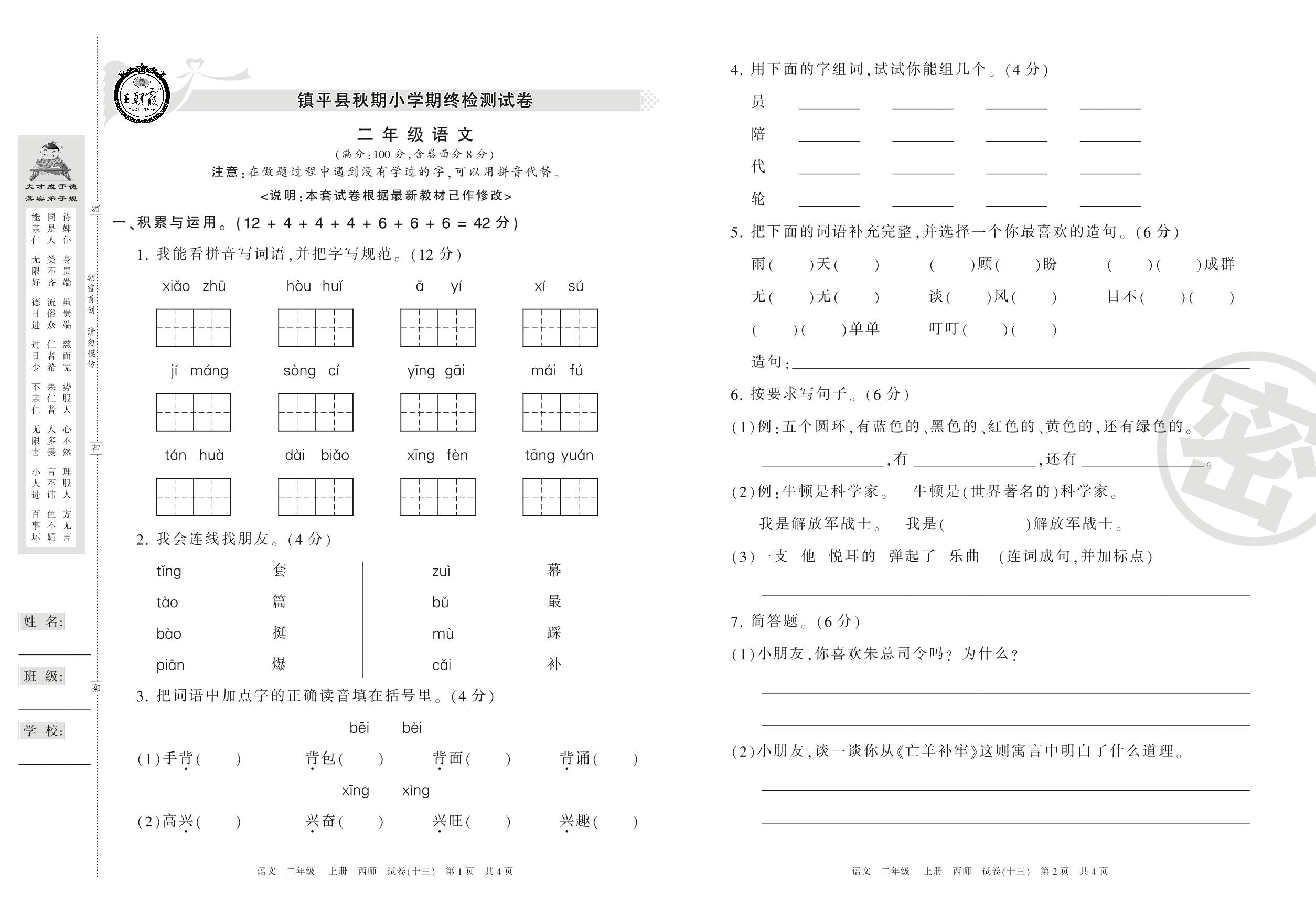 2016-2017学年第一学期南阳市镇平县二年级语文试卷(西师版)【13】