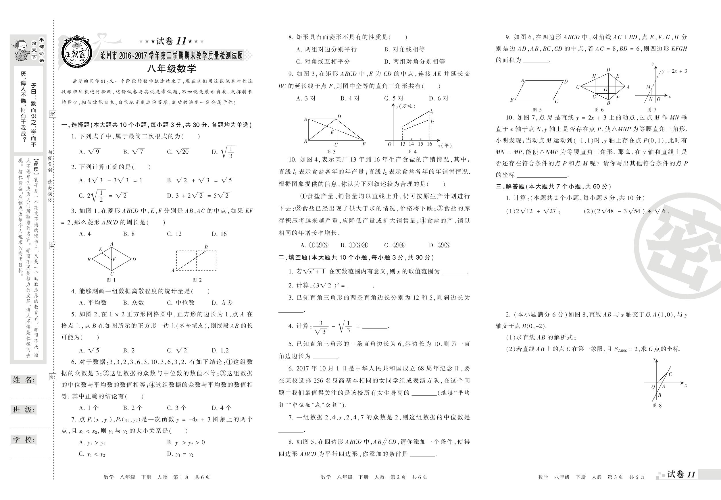 2016-2017学年第二学期沧州市八年级数学试卷(人教版)【11】