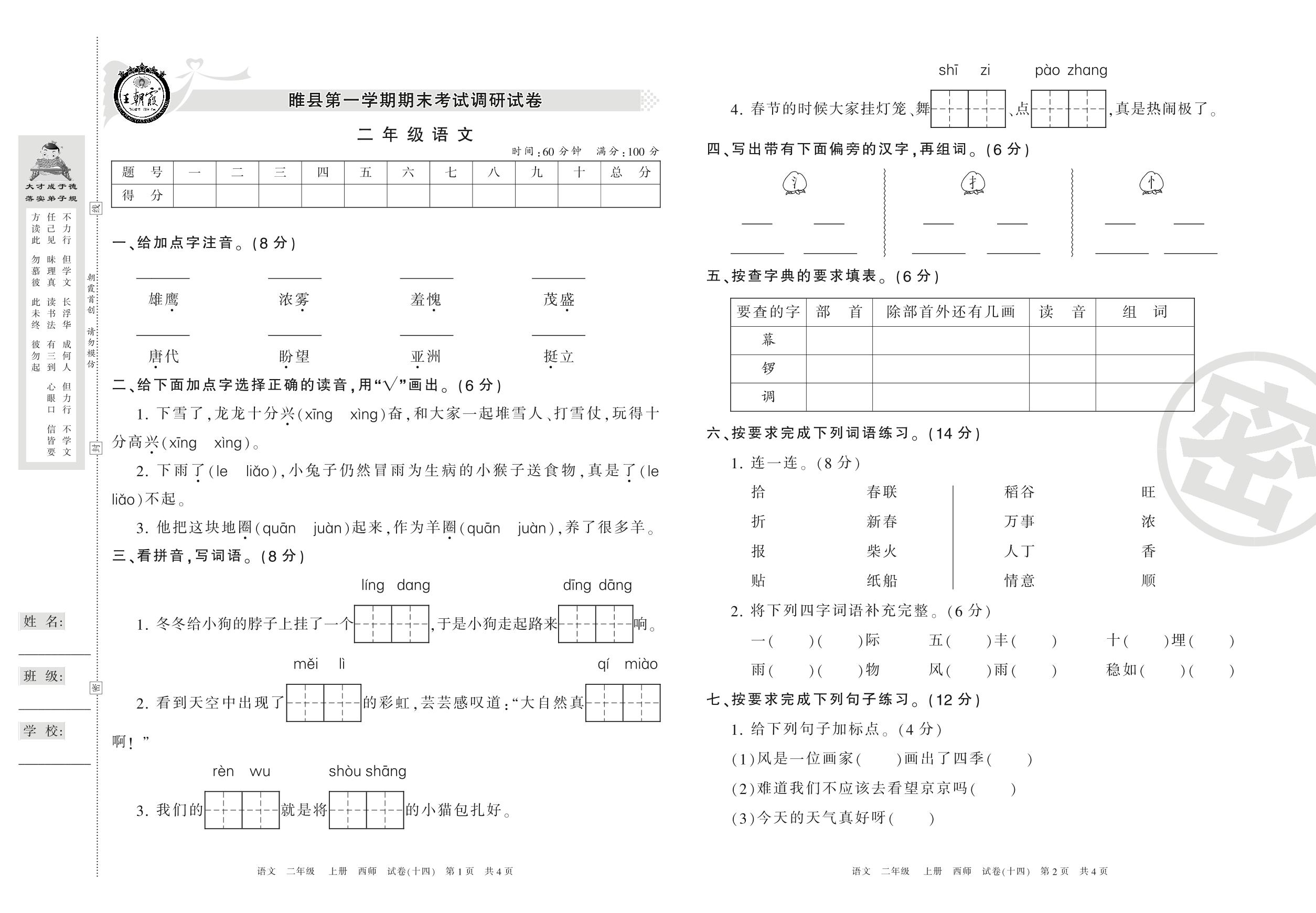 二年级语文西师版上册期末卷