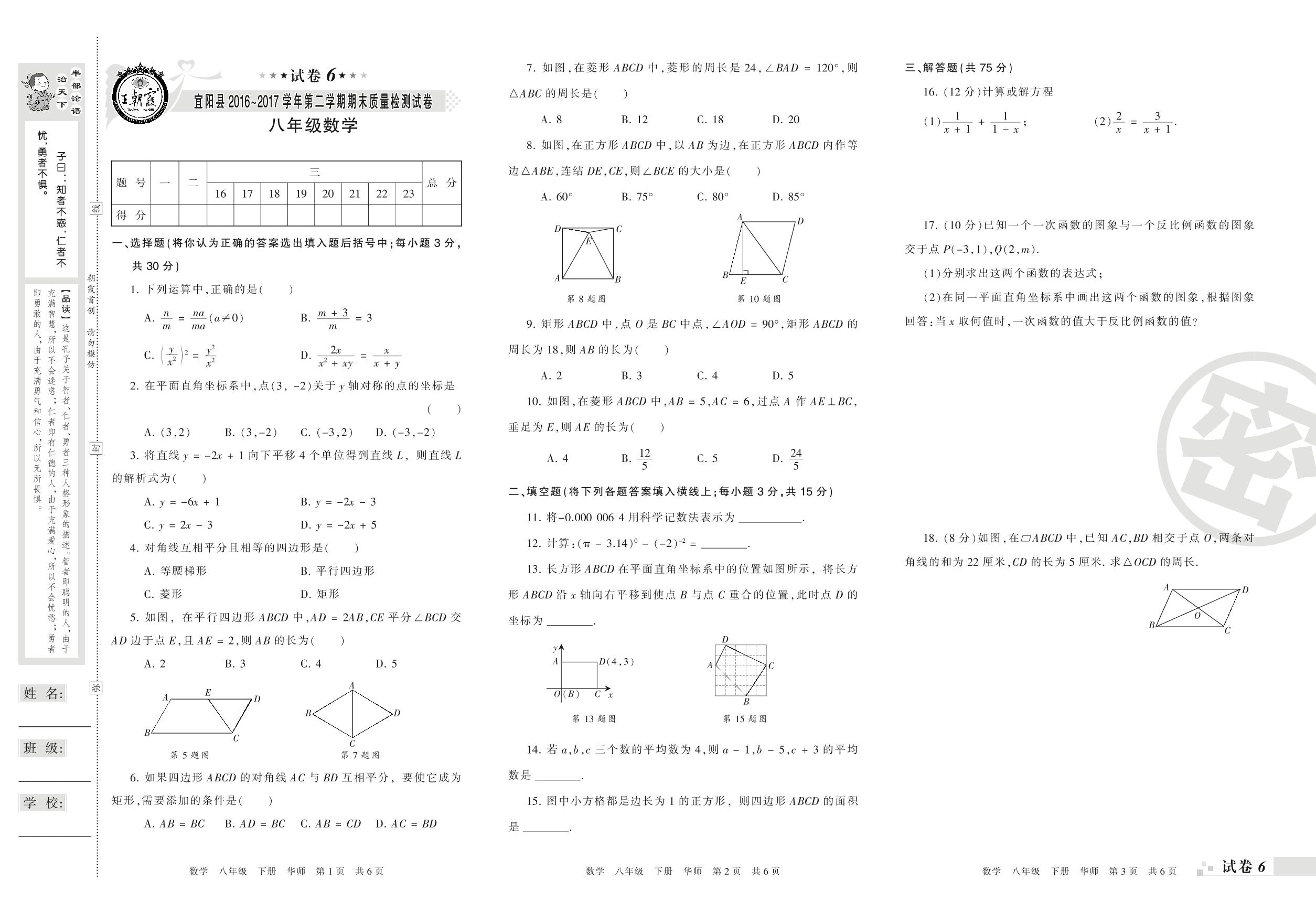 2016-2017学年第二学期洛阳市宜阳县八年级数学试卷(华师版)【6】