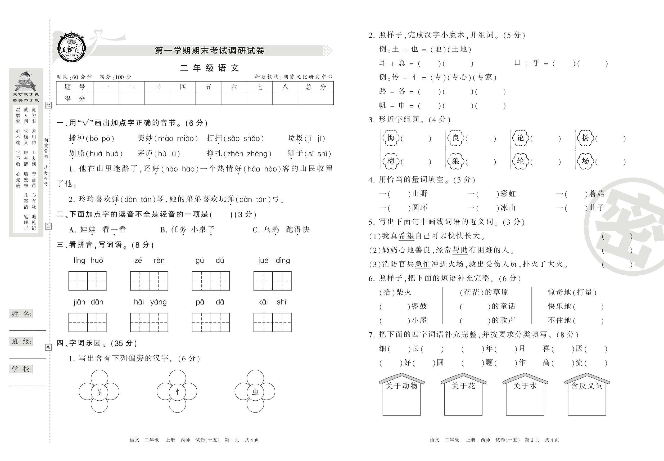 二年级语文西师版上册期末卷