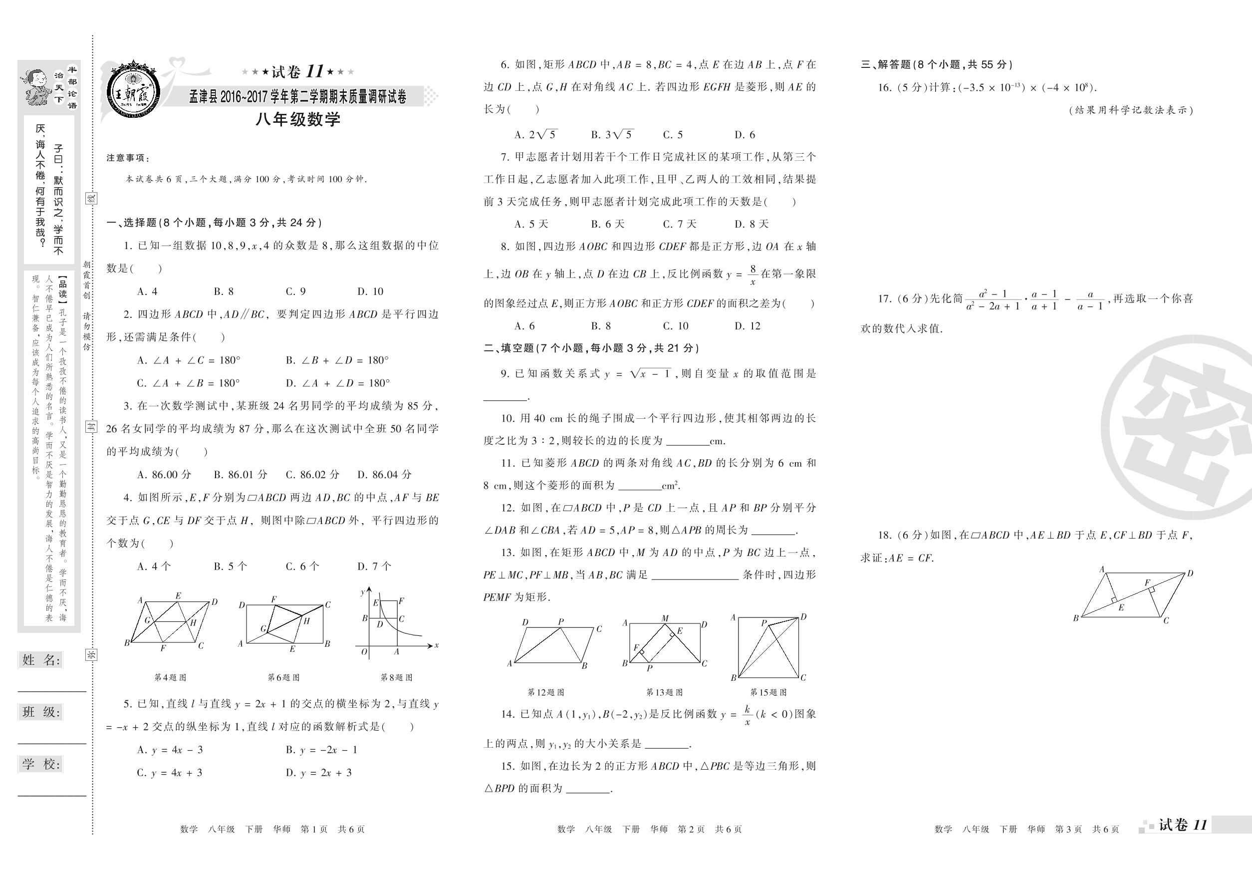 2016-2017学年第二学期洛阳市孟津县八年级数学试卷(华师版)【11】