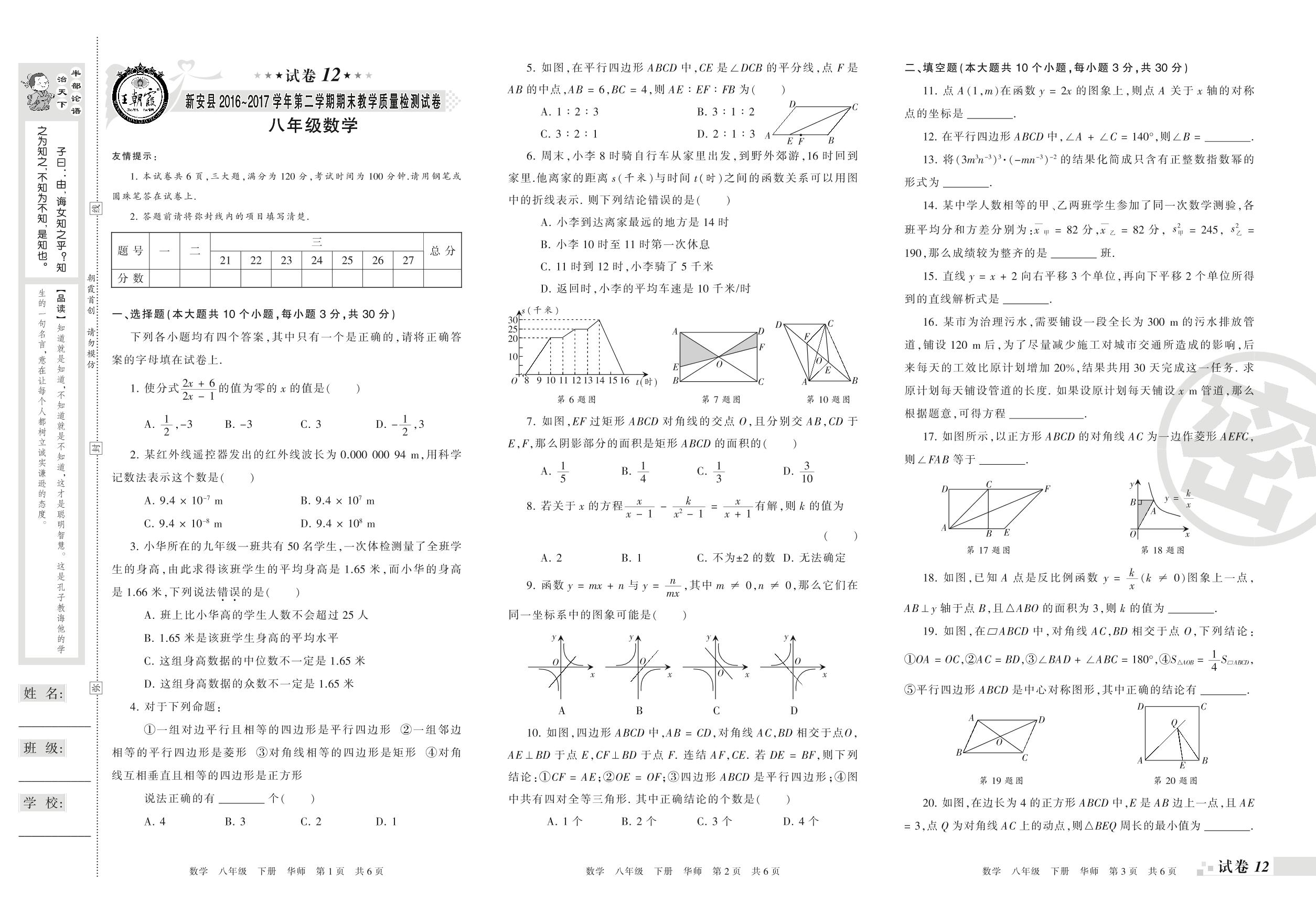 2016-2017学年第二学期洛阳市新安县八年级数学试卷(华师版)【12】