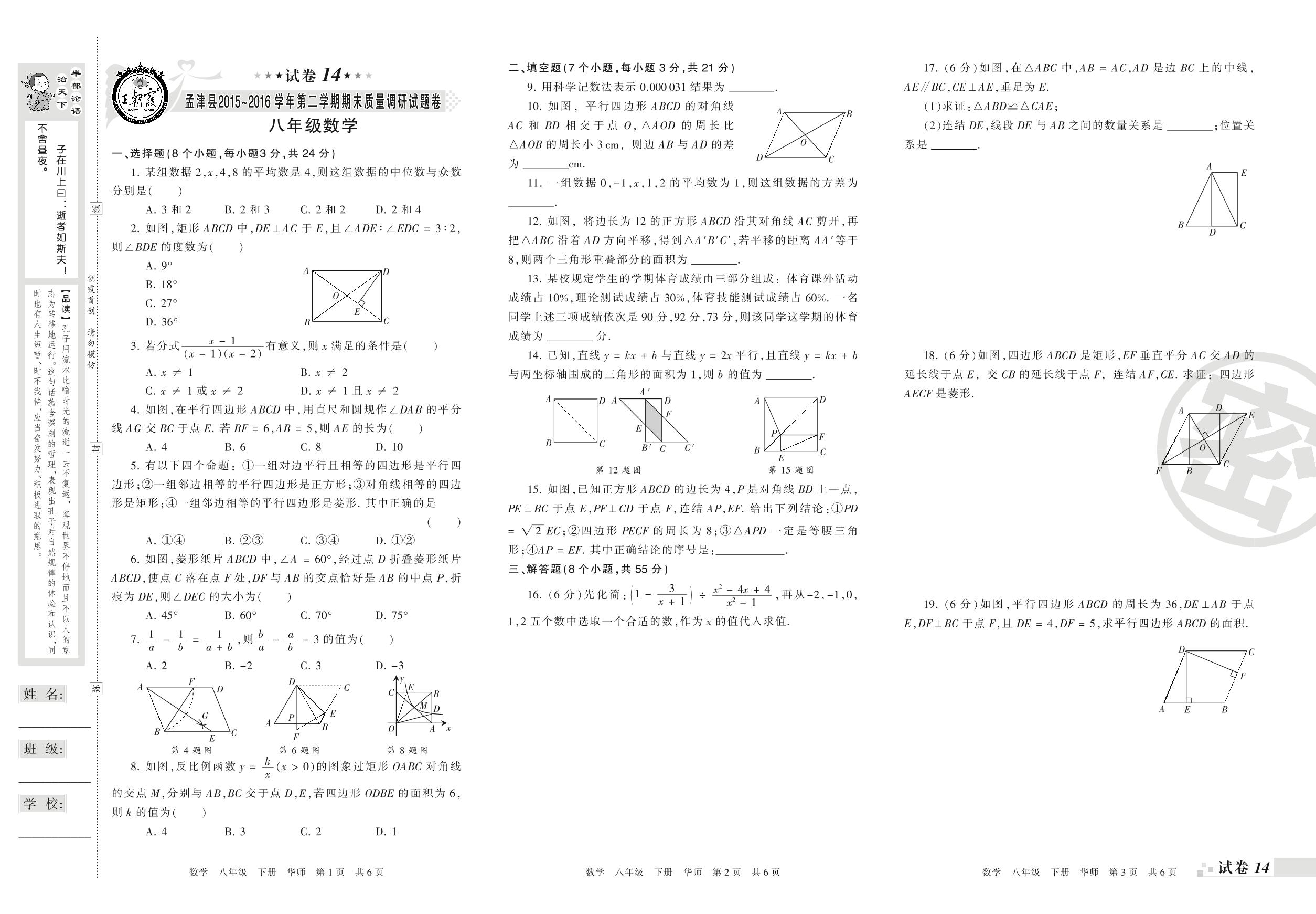 2015-2016学年第二学期洛阳市孟津县八年级数学试卷(华师版)【14】