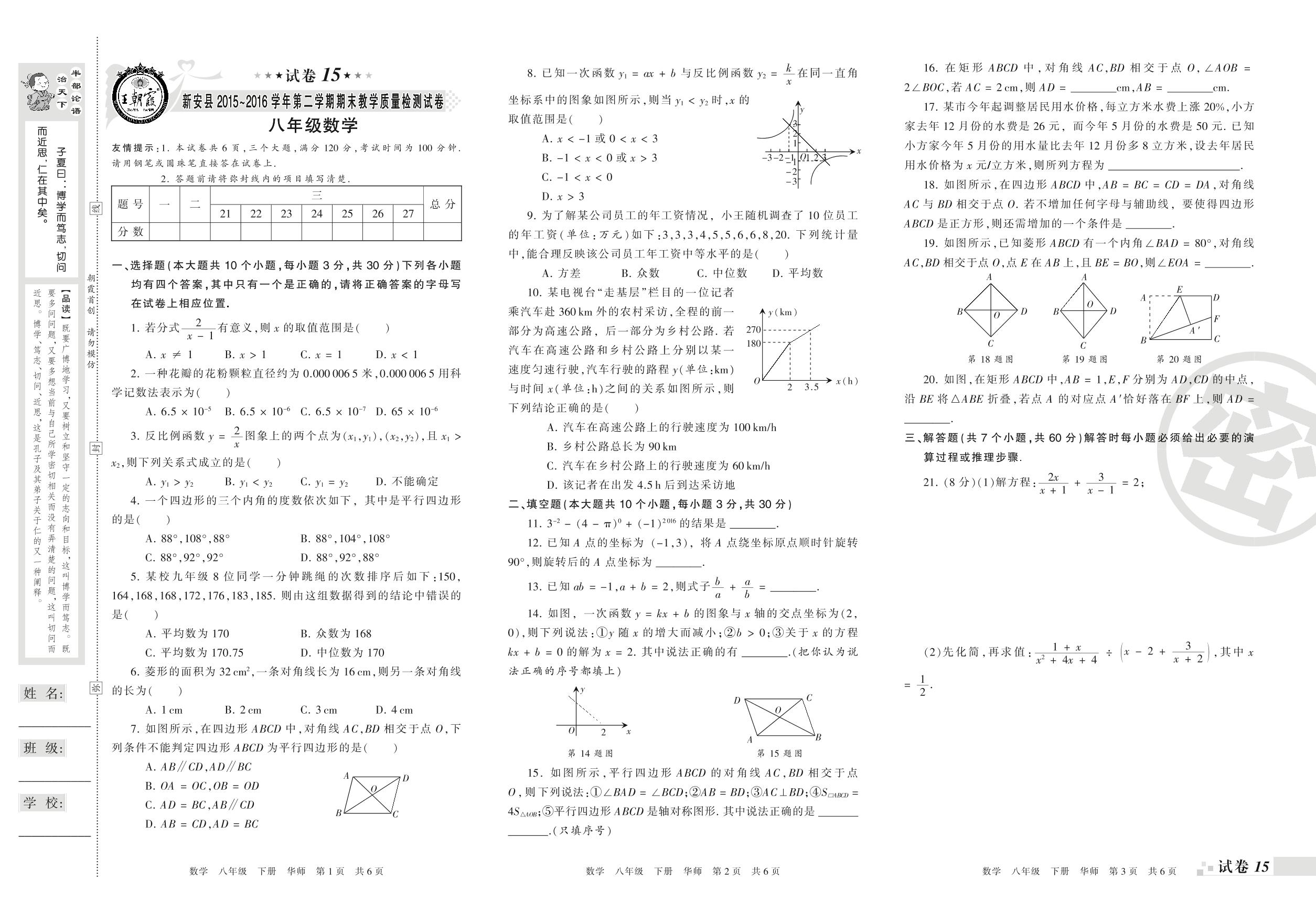 2015-2016学年第二学期洛阳市新安县八年级数学试卷(华师版)【15】