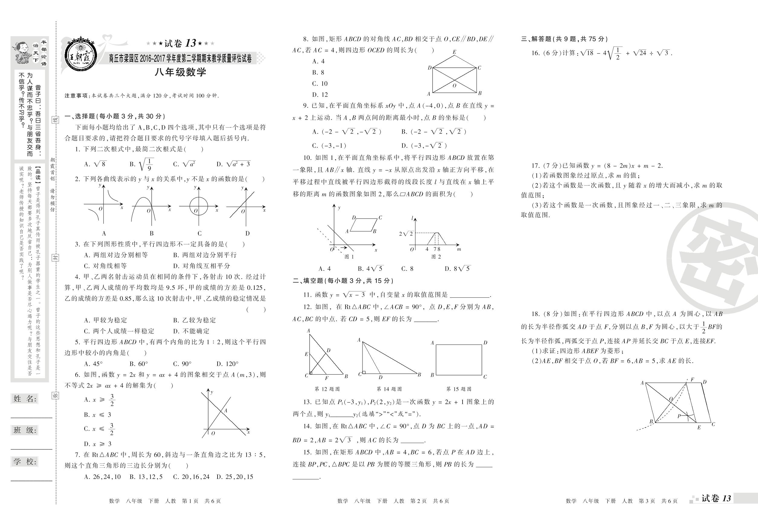 2016-2017学年第二学期商丘市梁园区八年级数学试卷(人教版)【13】