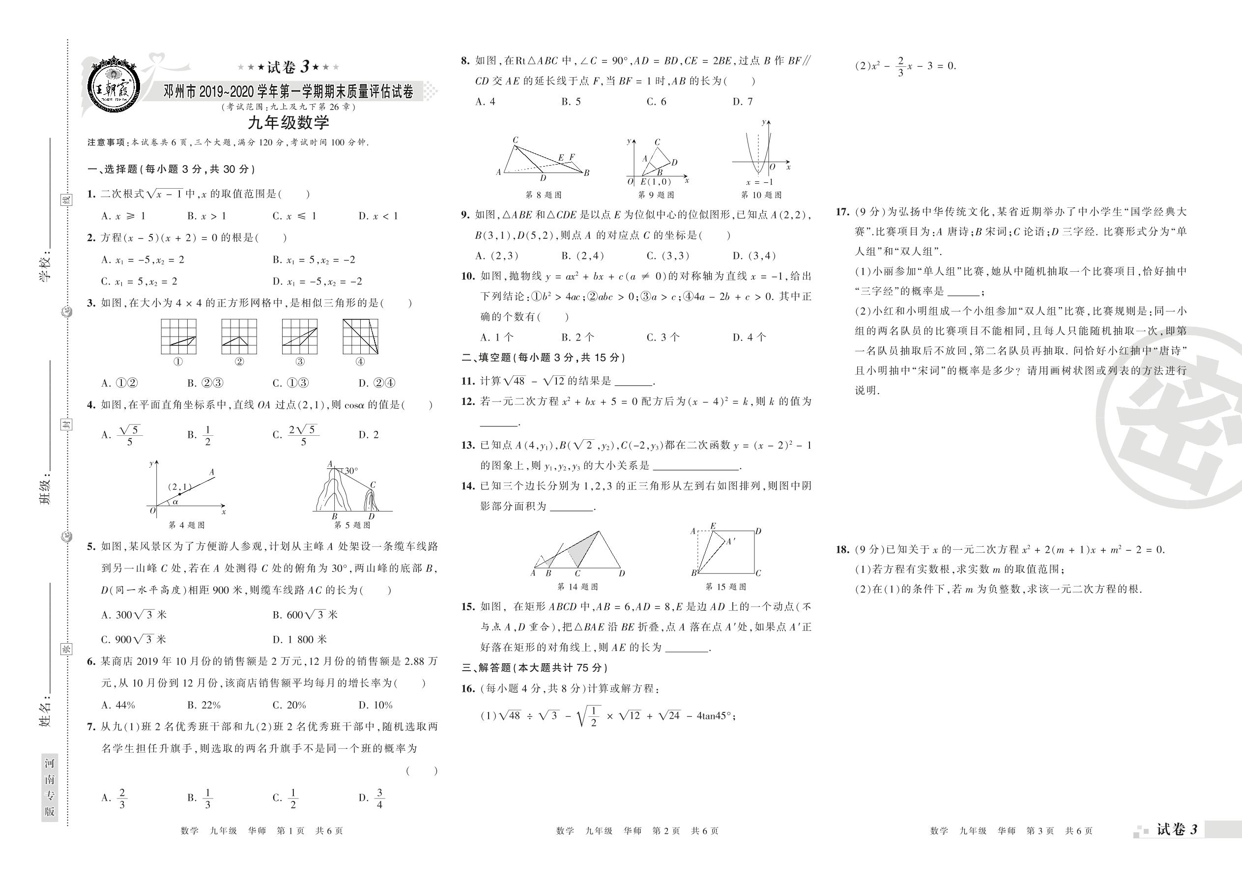 2019-2020学年第一学期邓州市九年级数学试卷(华师版)【3】