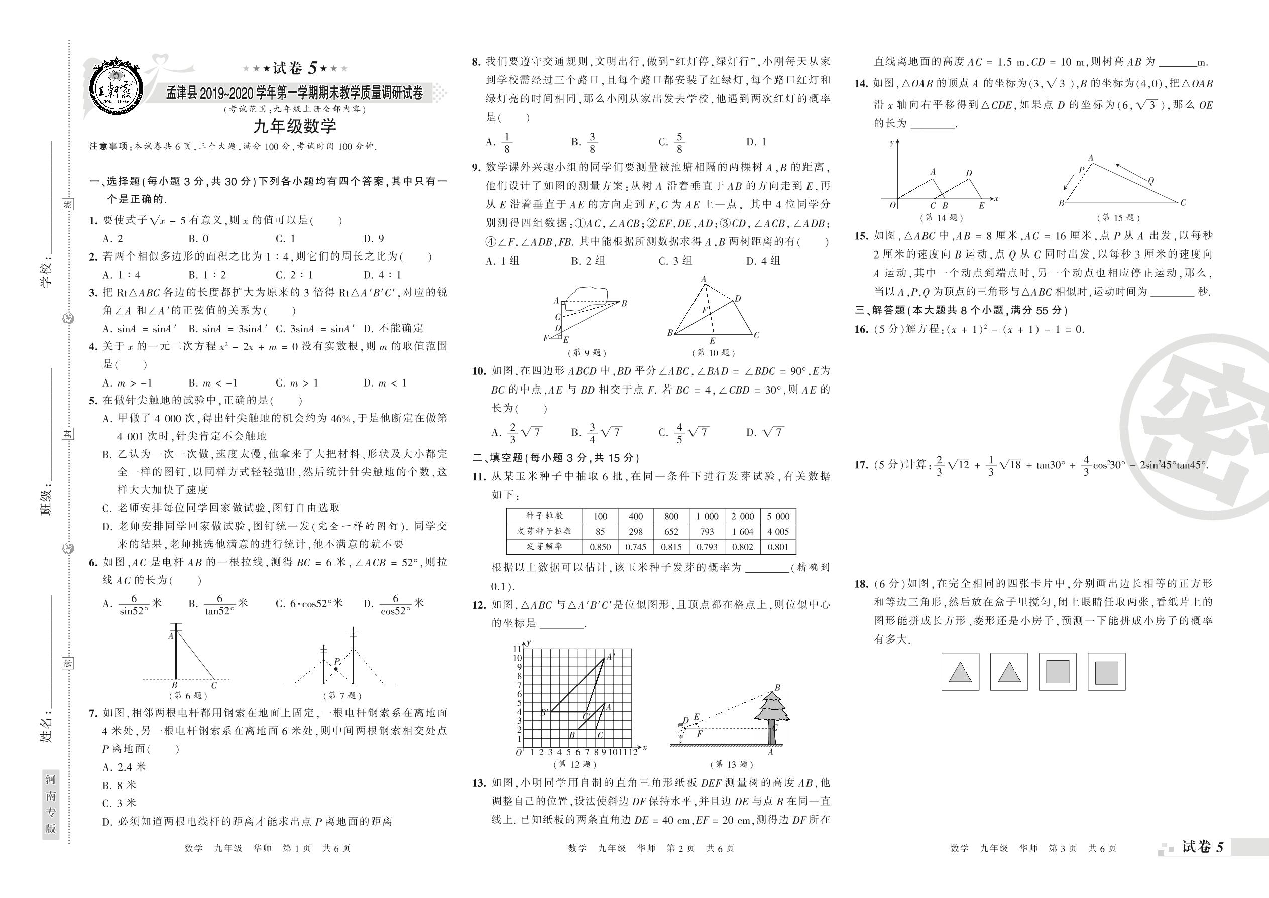 2019-2020学年第一学期洛阳市孟津县九年级数学试卷(华师版)【5】