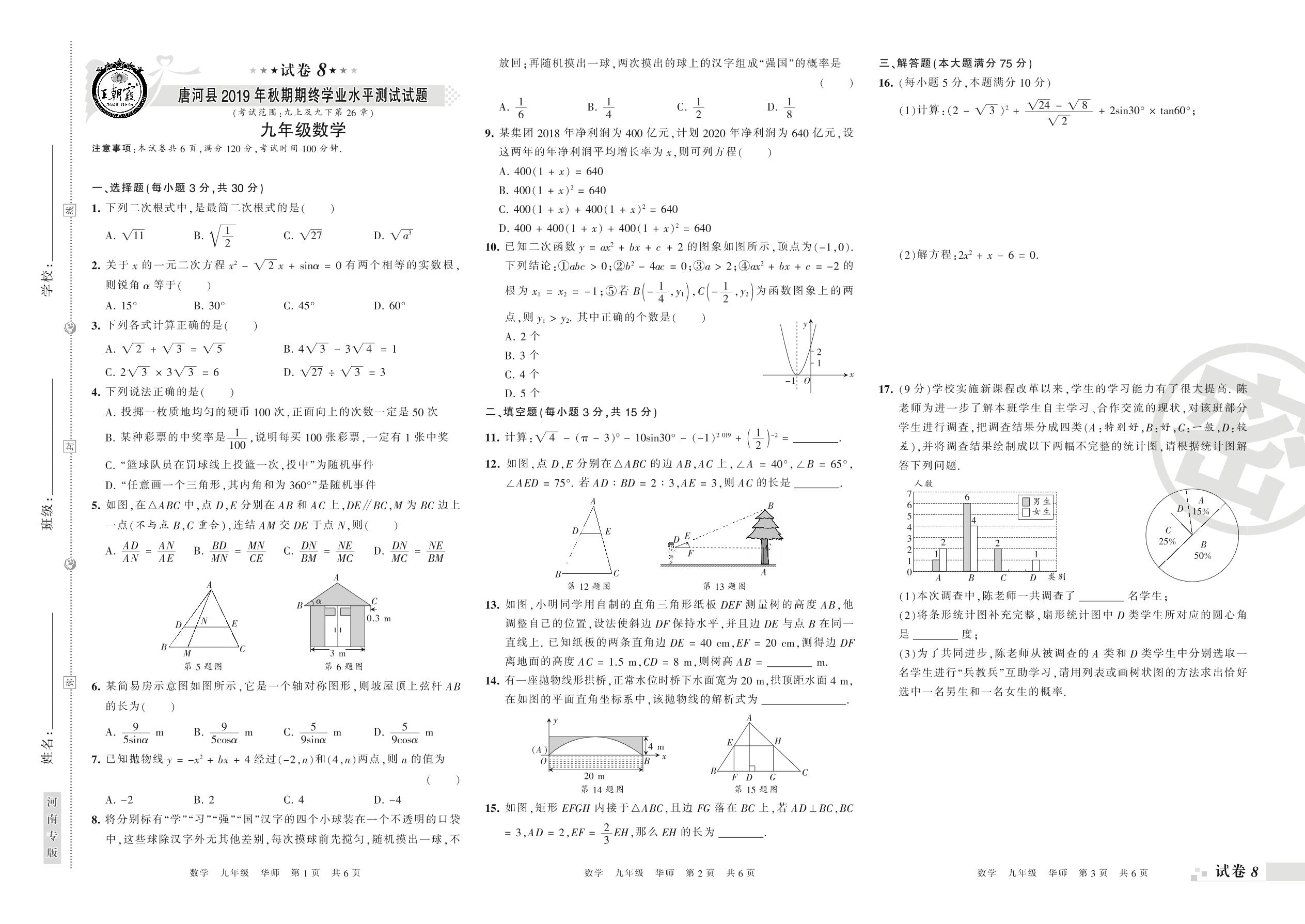 2019-2020学年第一学期南阳市唐河县九年级数学试卷(华师版)【8】