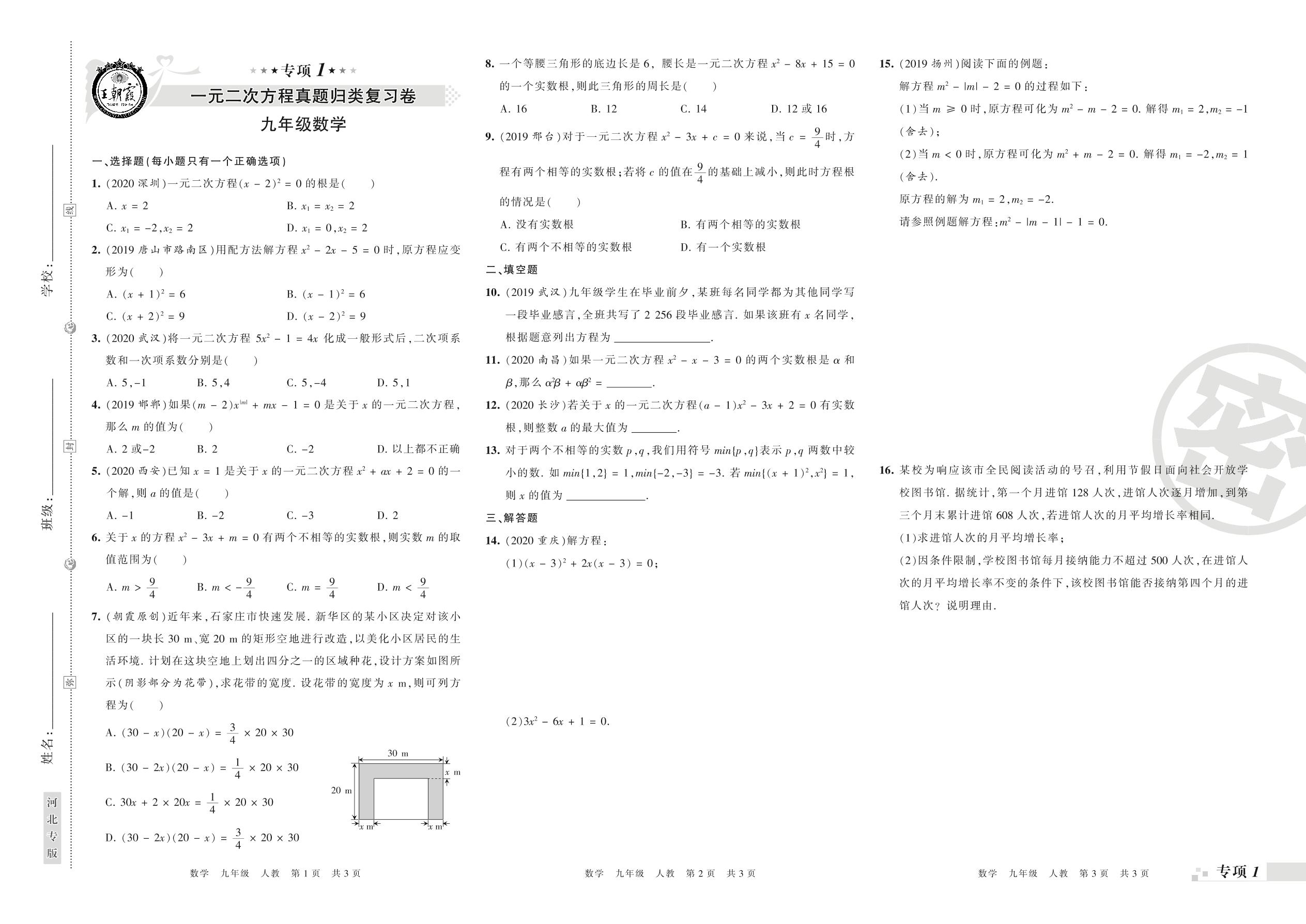 王朝霞期末专项卷——一元一次方程、二次函数的图象和性质真题归类复习九年级上册数学(人教版)【0】