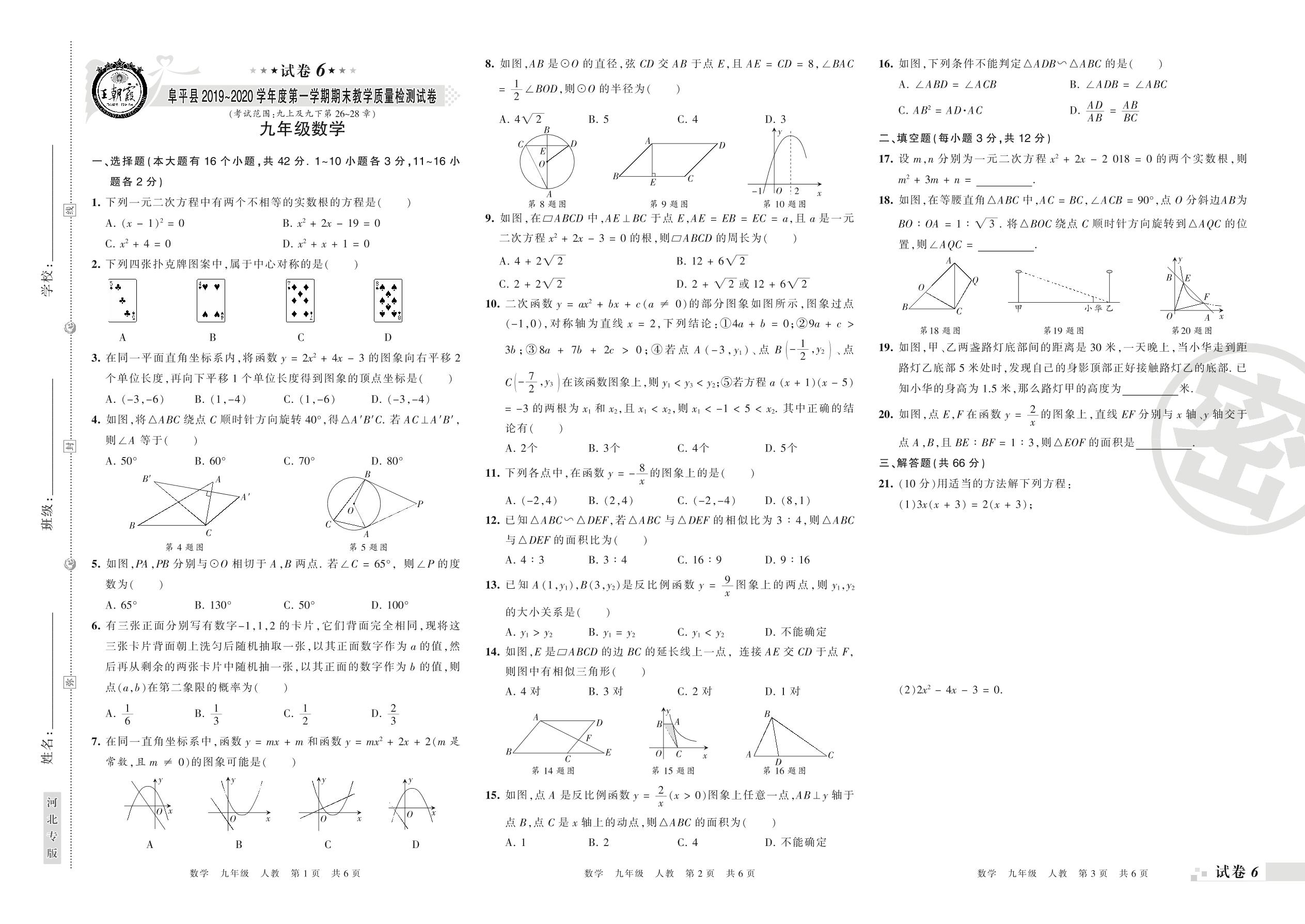 2019-2020学年第一学期保定市阜平县九年级数学试卷(人教版)【6】