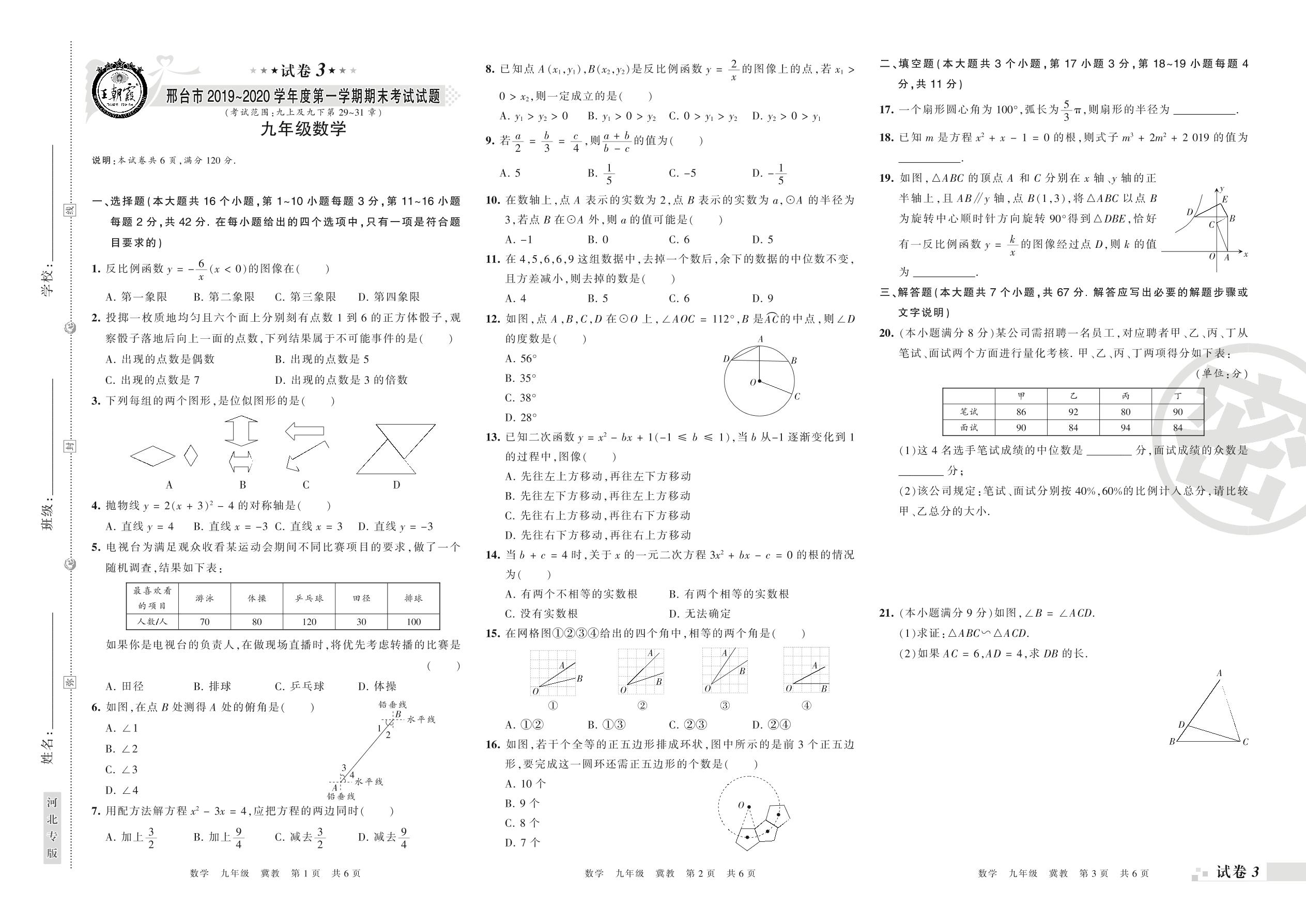 2019-2020学年第一学期邢台市九年级数学试卷(冀教版)【3】