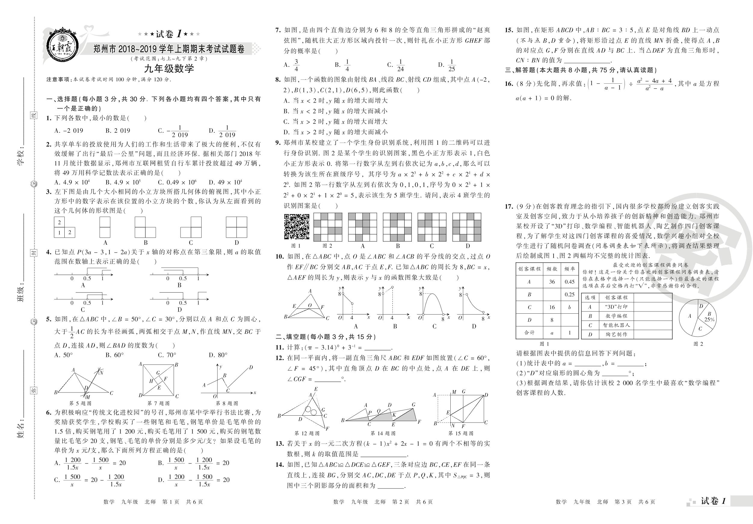 2018-2019学年第一学期郑州市九年级数学试卷(北师版)【1】