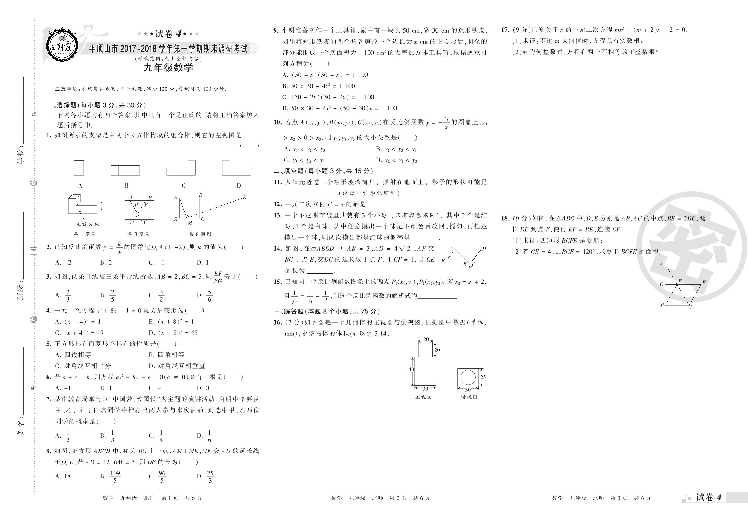 2017-2018学年第一学期平顶山市九年级数学试卷(北师版)【4】