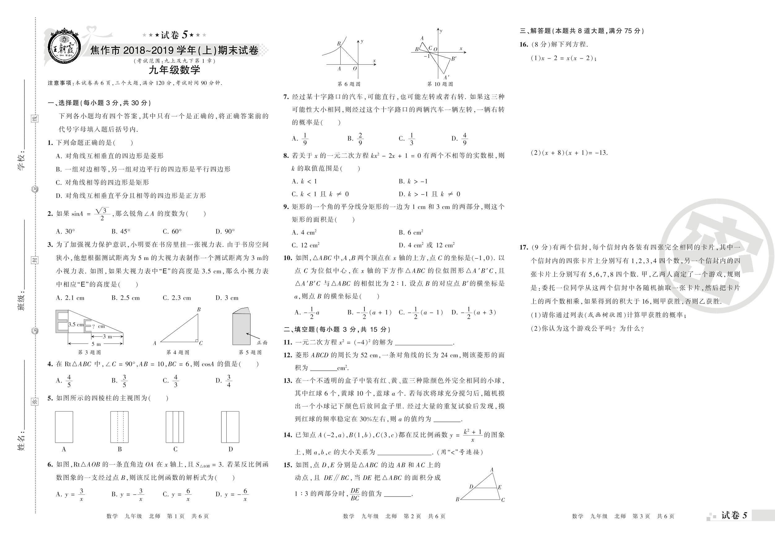 2018-2019学年第一学期焦作市九年级数学试卷(北师版)【5】