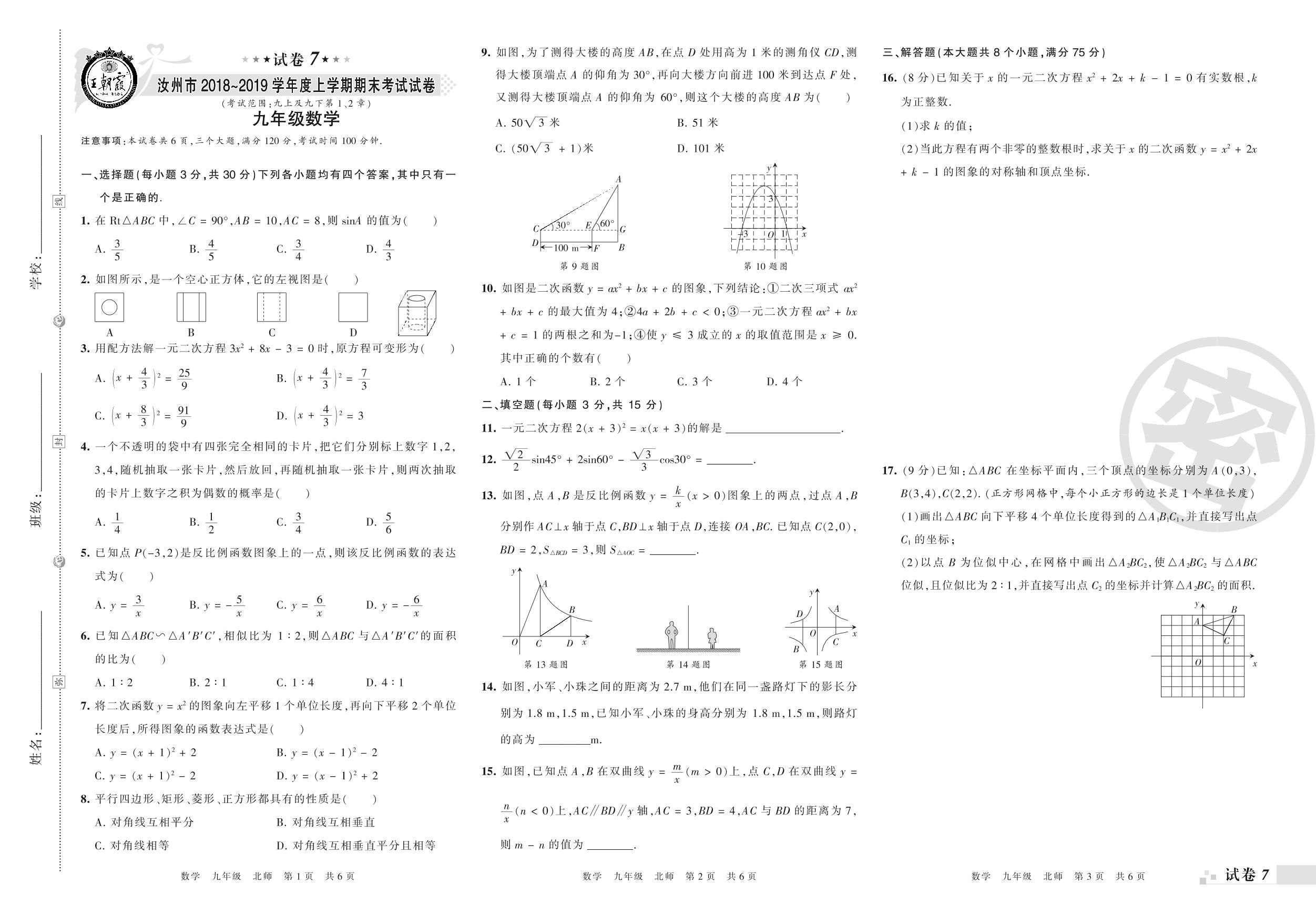 2018-2019学年第一学期汝州市九年级数学试卷(北师版)【7】
