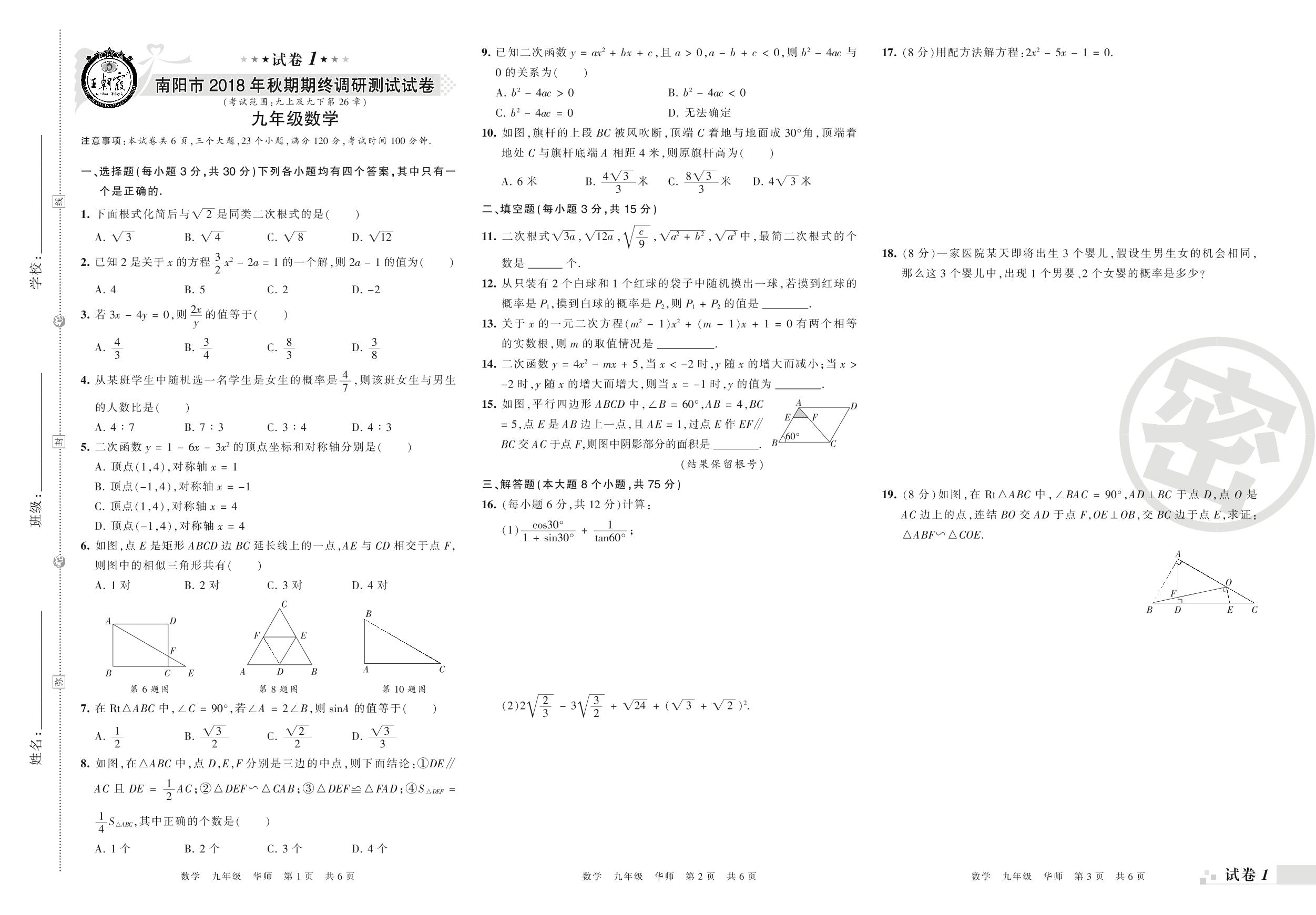 2018-2019学年第一学期南阳市九年级数学试卷(华师版)【1】