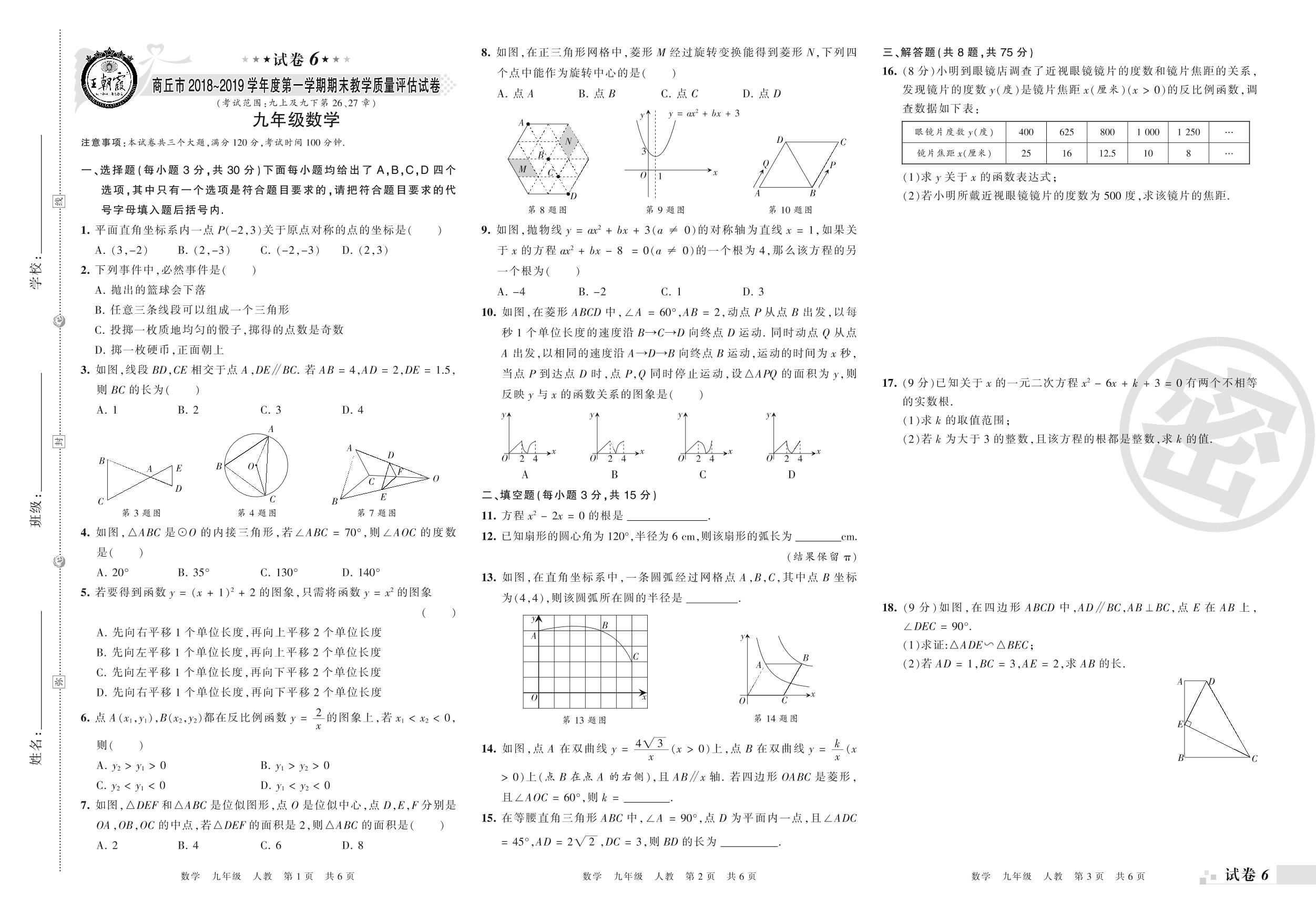 2018-2019学年第一学期商丘市九年级数学试卷(人教版)【6】
