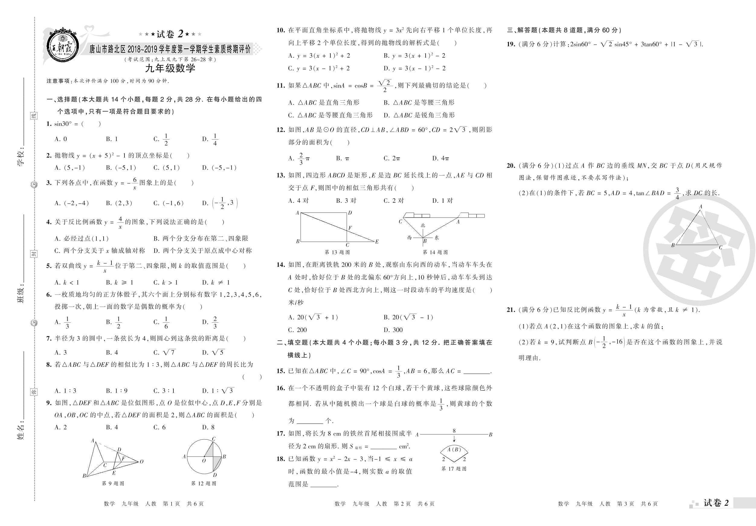 2018-2019学年第一学期唐山市路北区九年级数学试卷(人教版)【2】