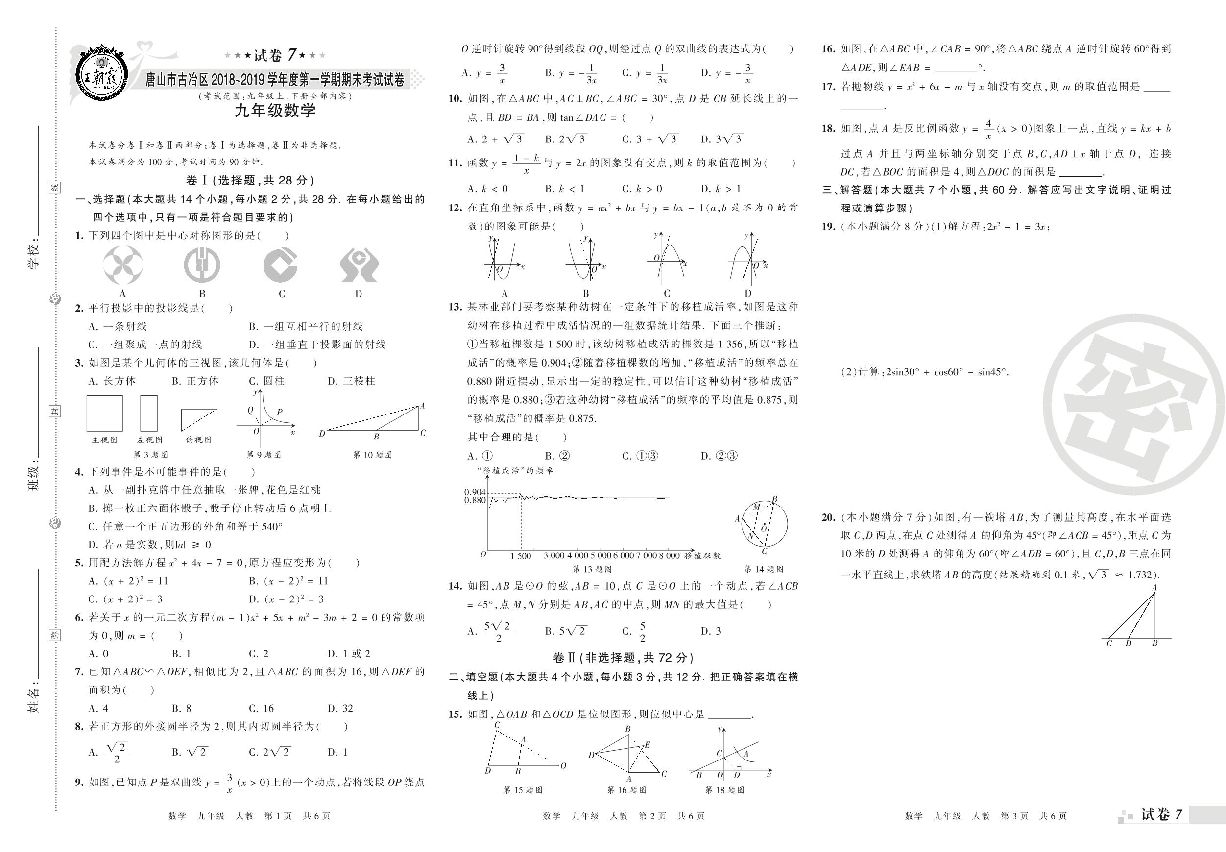 2018-2019学年第一学期唐山市古冶区九年级数学试卷(人教版)【7】