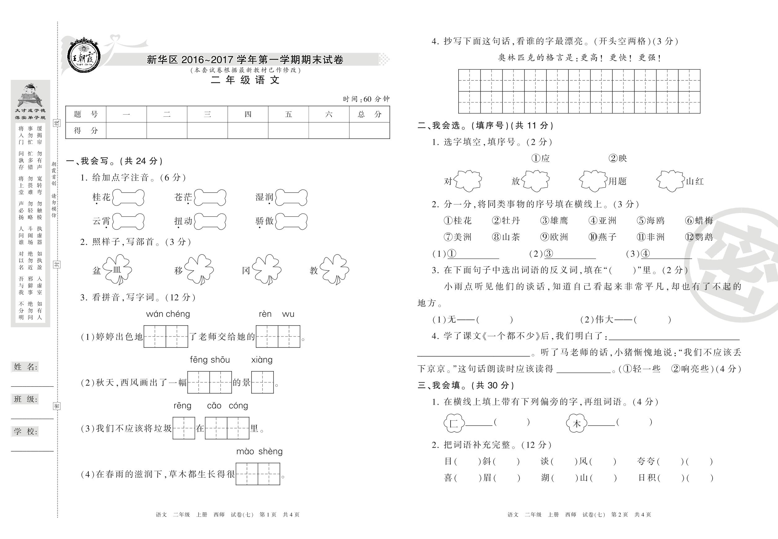 2016-2017学年第一学期平顶山市新华区二年级语文试卷(西师版)【7】