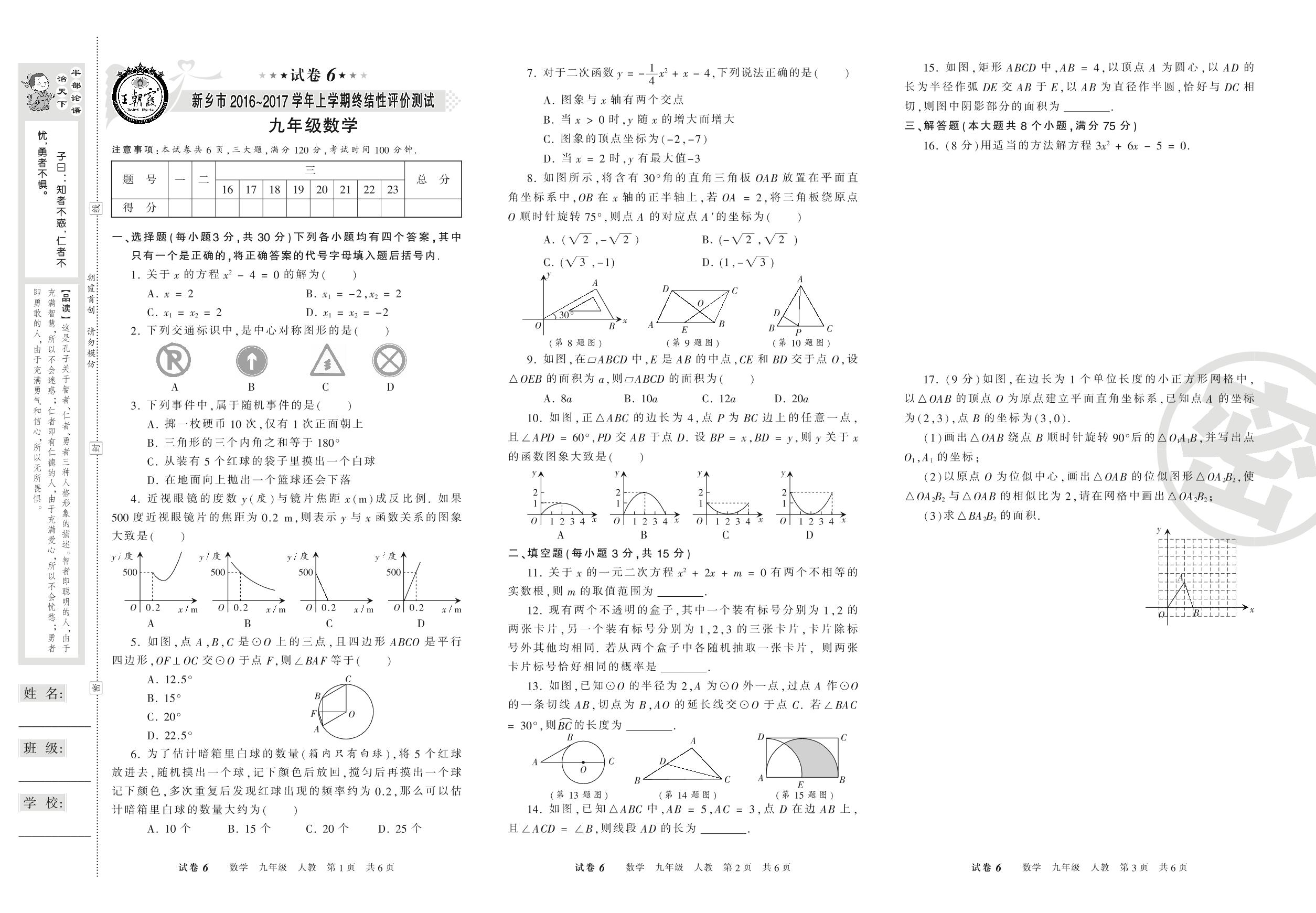 2016-2017学年第一学期新乡市九年级数学试卷(人教版)【6】