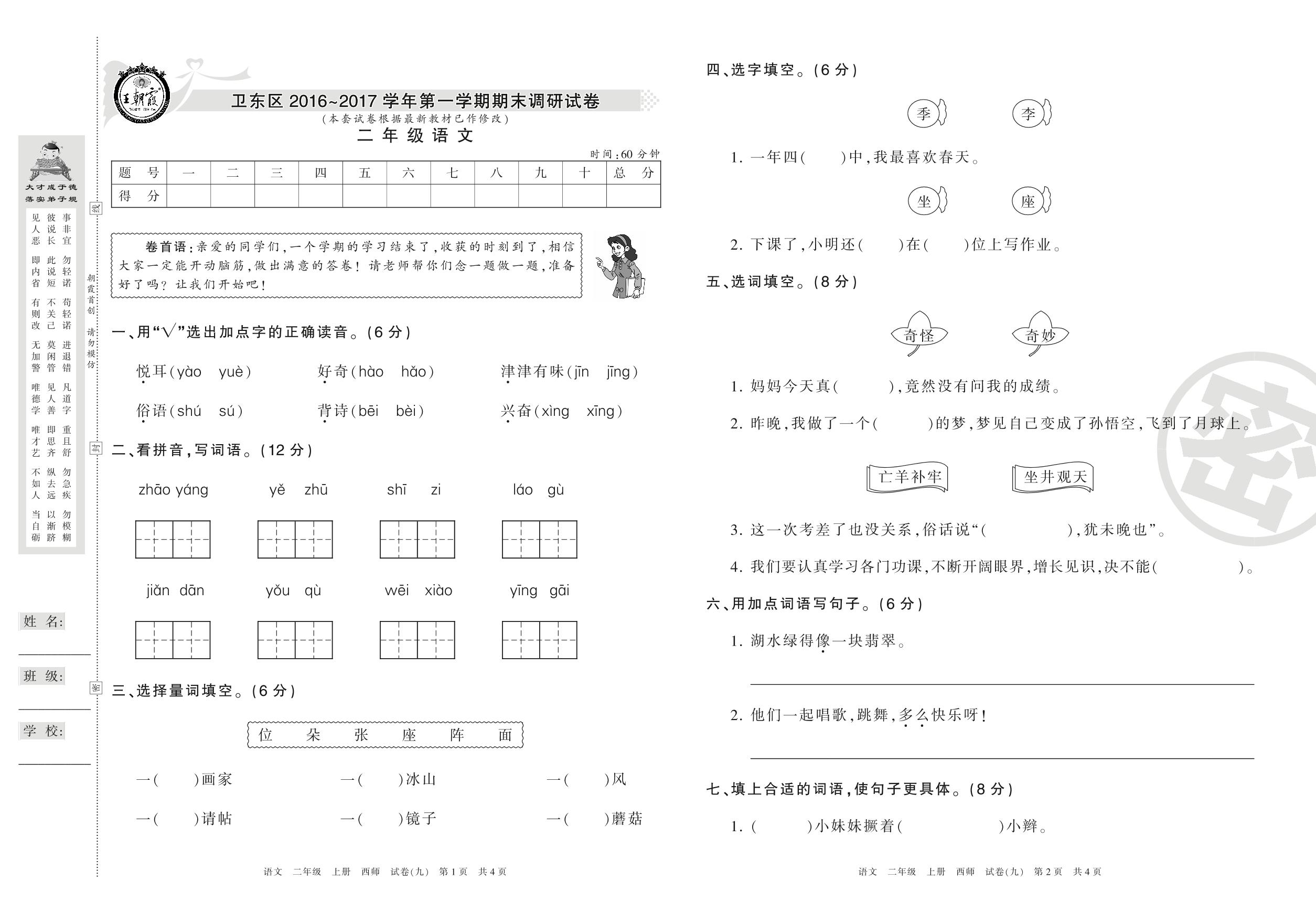 二年级语文西师版上册期末卷