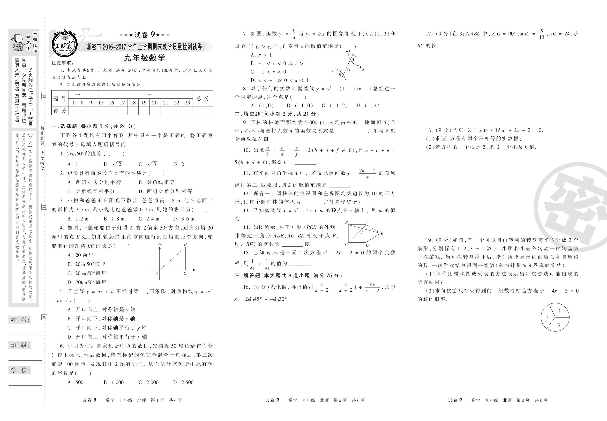 2016-2017学年第一学期新密市九年级数学试卷(北师版)【9】